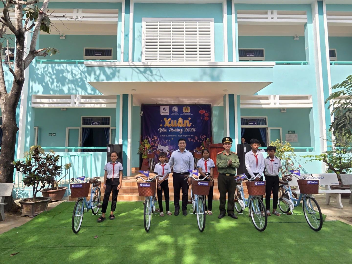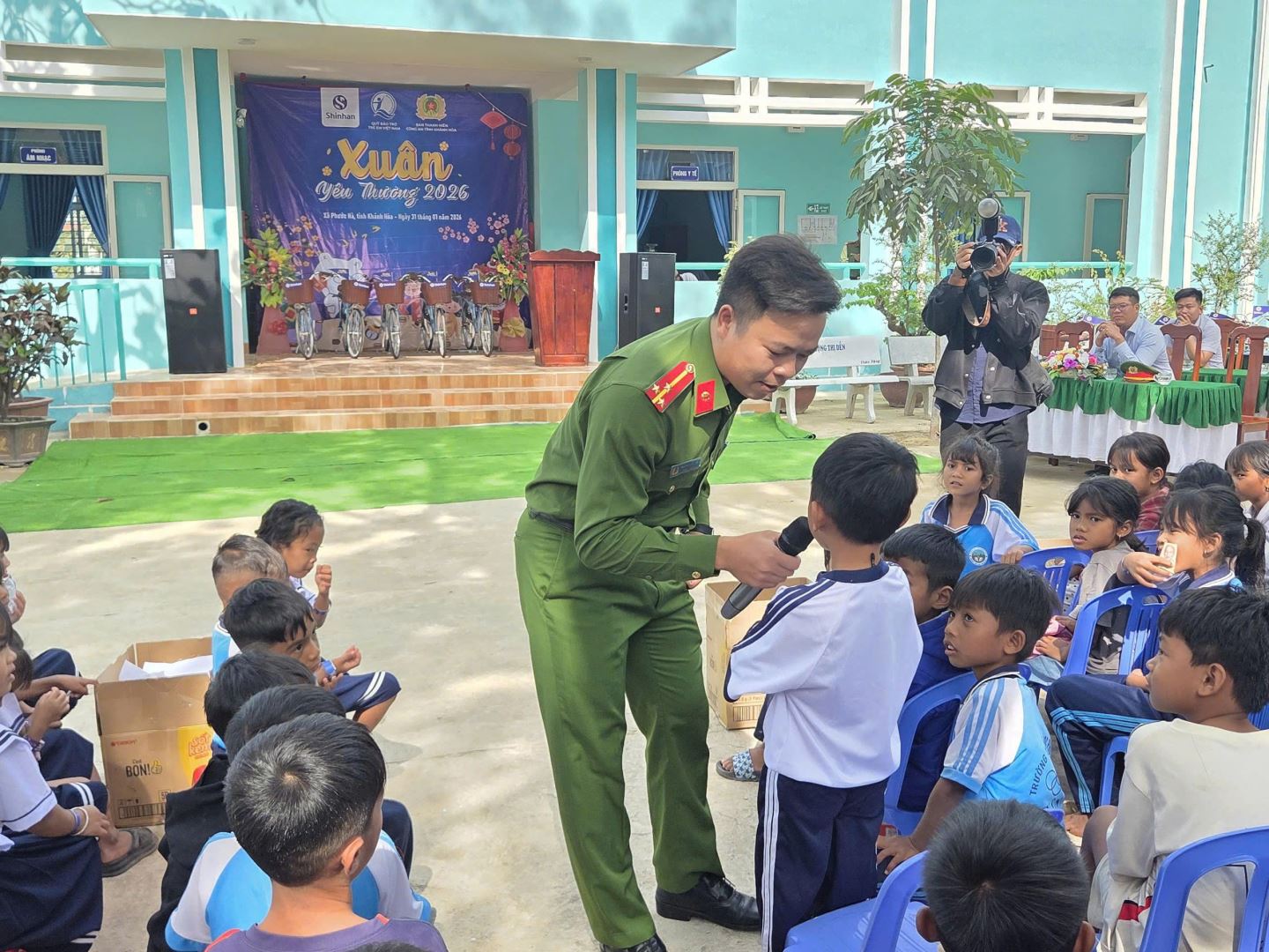 Chương trình “Xuân yêu thương” năm 2026 được Ban Thanh niên Công an tỉnh tổ chứcVới tổng nguồn lực thực hiện chương trình là 100.000.000 đồngbao gồm nhiều hoạt động ý nghĩa:(1)Tổ chức tuyên truyền pháp luật về phòng cháy, chữa cháy và cứu nạn, cứu hộ cho Nhân dân, đoàn viên thanh niên và học sinh trên địa bàn xã Phước Hà, tỉnh Khánh Hoà; (2)Trao tặng 10 chiếc xe đạp, mỗi chiếc xe đạp trị giá 2.500.000 đồng (với tổng trị giá 25 triệu đồng) cho 10 em học sinh có hoàn cảnh khó khăn đạt thành tích cao trong học tập trên địa bàn xã Phước Hà; (3)Trao tặng quà (đồ dùng học tập, bánh kẹo…), mỗi phần quà trị giá 100.000 đồng cho 463 em học sinh Trường tiểu học Phước Hà, thôn Giá, xã PHước Hà.