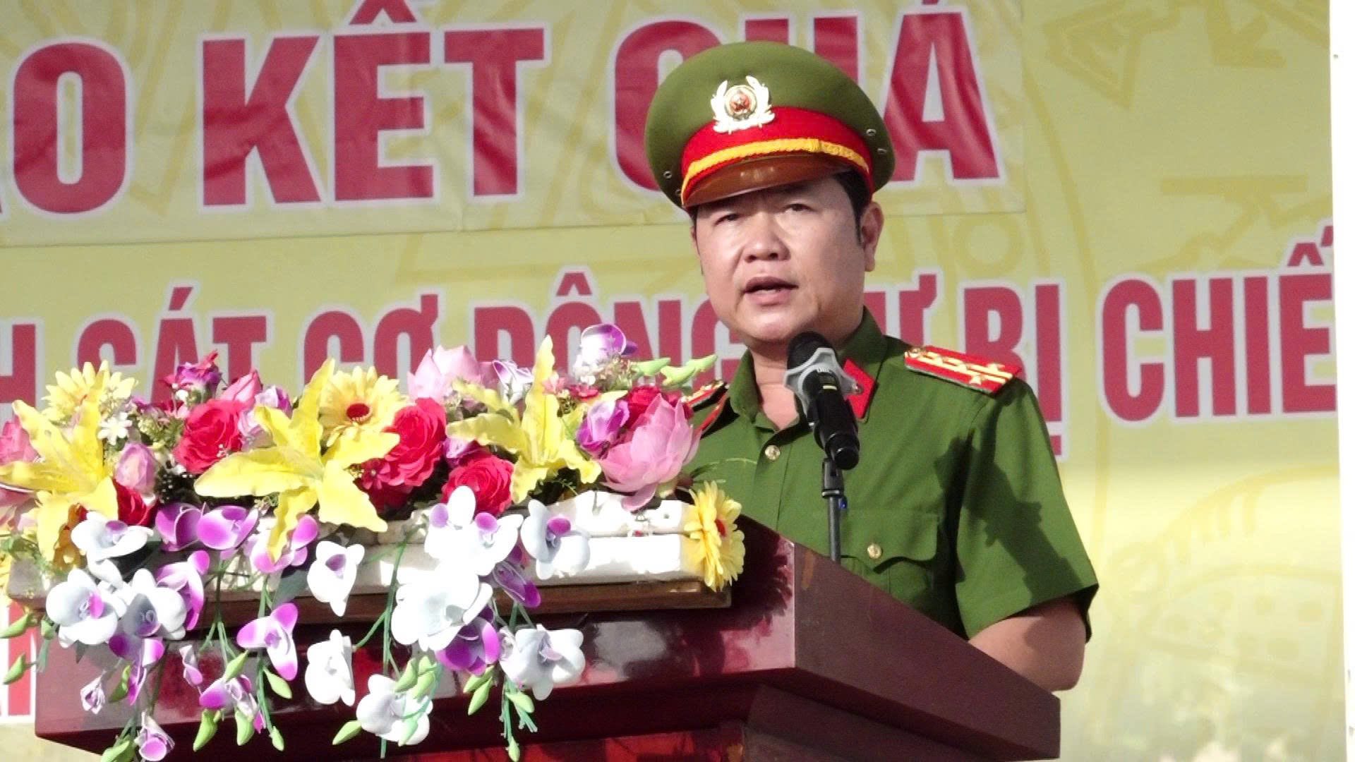 Phát biểu tại buổi lễ, Đại tá Lê Quang Dũng, Phó Giám đốc Công an tỉnh đã ghi nhận, biểu dương tinh thần trách nhiệm, sự nỗ lực của Tổ giáo viên huấn luyện và toàn thể cán bộ, chiến sĩ trong quá trình huấn luyện. Đồng thời đồng chí đề nghị các học viên cần vận dụng linh hoạt các kiến thức, kỹ năng vào thực tiễn công tác tại cơ sở, đồng thời luôn nêu cao tinh thần cảnh giác, chủ động sẵn sàng ứng phó với mọi tình huống phát sinh liên quan đến an ninh trật tự tại cơ sở. Phát huy hiệu quả hoạt động của Tiểu đoàn Cảnh sát cơ động dự bị chiến đấu trong công tác giữ gìn trật tự an toàn xã hội, công tác cứu nạn cứu hộ, khắc phục hậu quả thiên tai…
