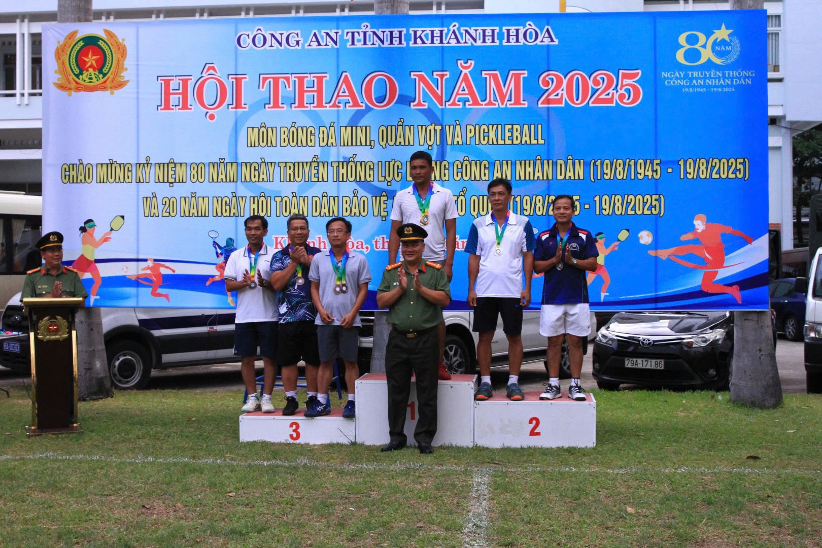 Đ/c Đại tá Nguyễn Mậu An, Ủy viên Ban Thường vụ Đảng ủy, Phó Giám đốc Công an tỉnh trao giải nội dung đôi nam Lãnh đạo và cán bộ môn Pickleball.
