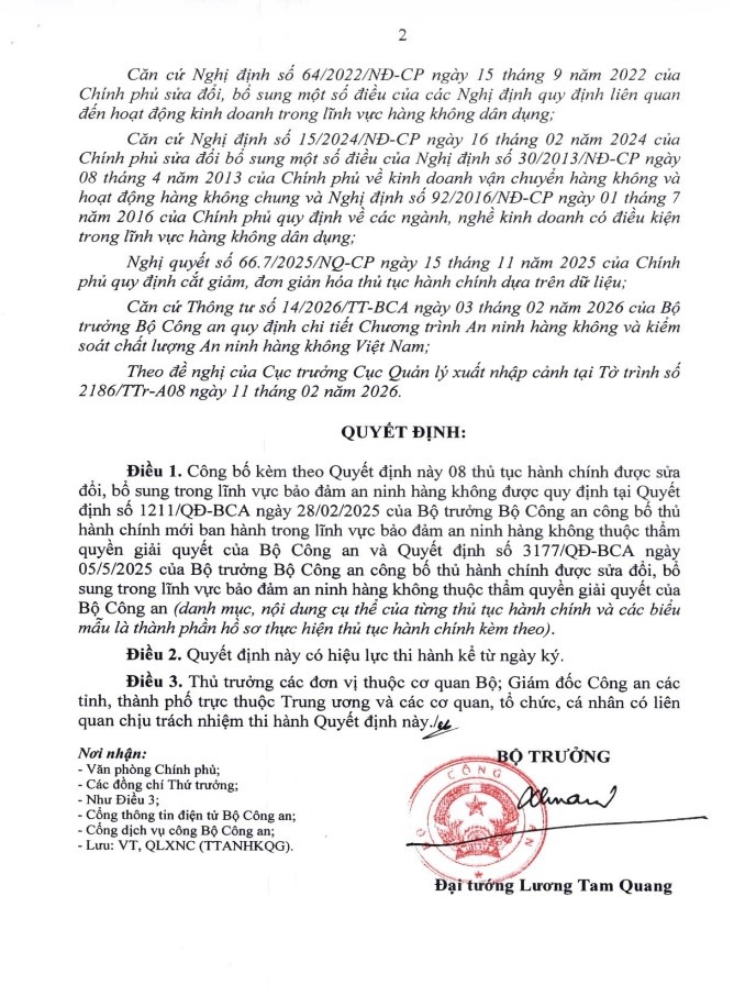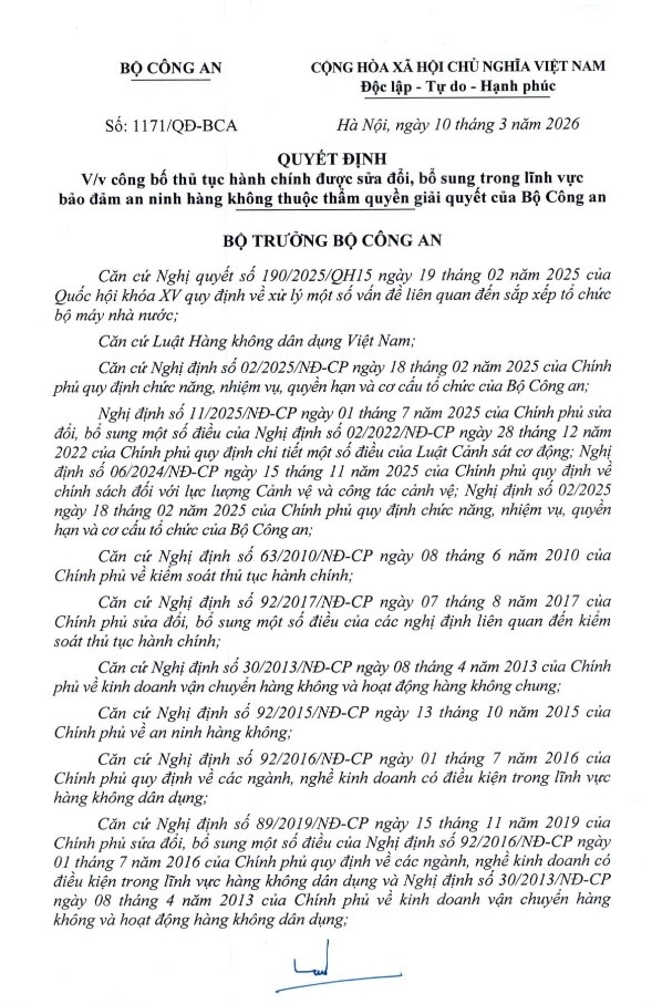 Ngày 10/3/2026, Bộ trưởng Bộ Công an đã ban hành Quyết định số 1171/QĐ-BCA công bố các thủ tục hành chính được sửa đổi, bổ sung trong lĩnh vực an ninh hàng không thuộc thẩm quyền giải quyết của Bộ Công an.