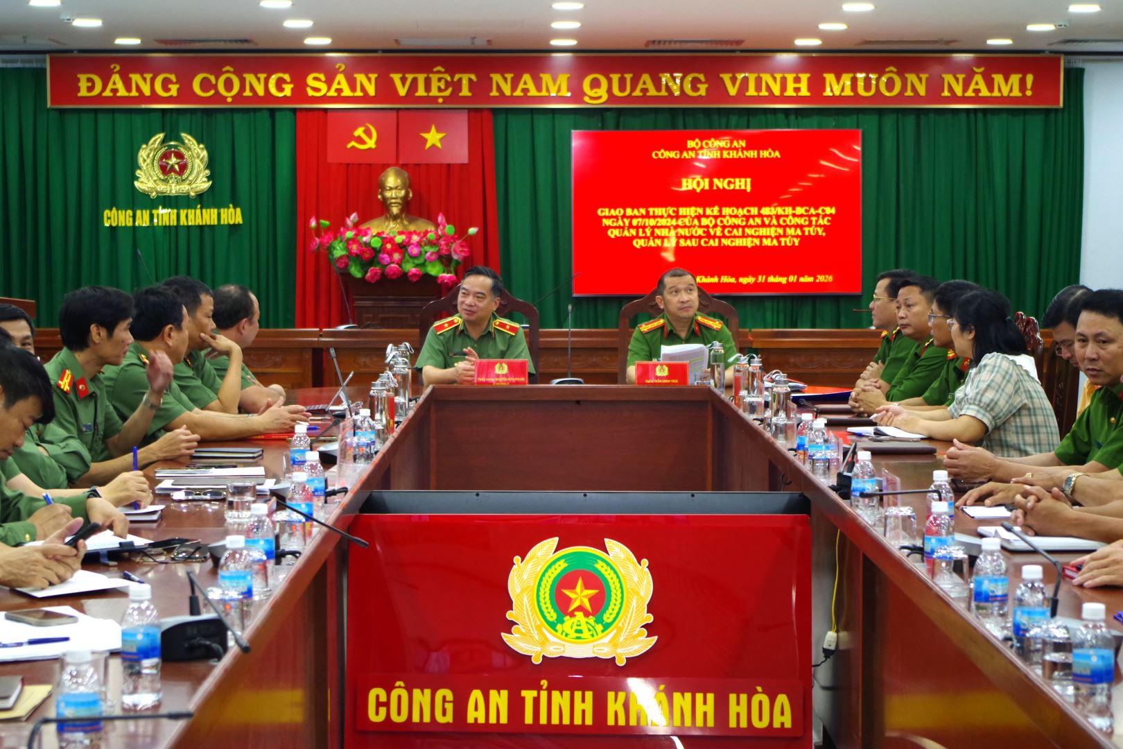 Đồng Chí Thiếu tướng Nguyễn Hữu Phước, Uỷ viên Ban Thường vụ Tỉnh Uỷ, Bí Thư Đảng uỷ, Giám đốc Công an tỉnh Khánh Hoà và Đồng chí Đại tá Trần Minh Trúc, Phó Giám đốc Công an tỉnh đồng chủ trì Hội nghị tại điểm cầu Công an tỉnh