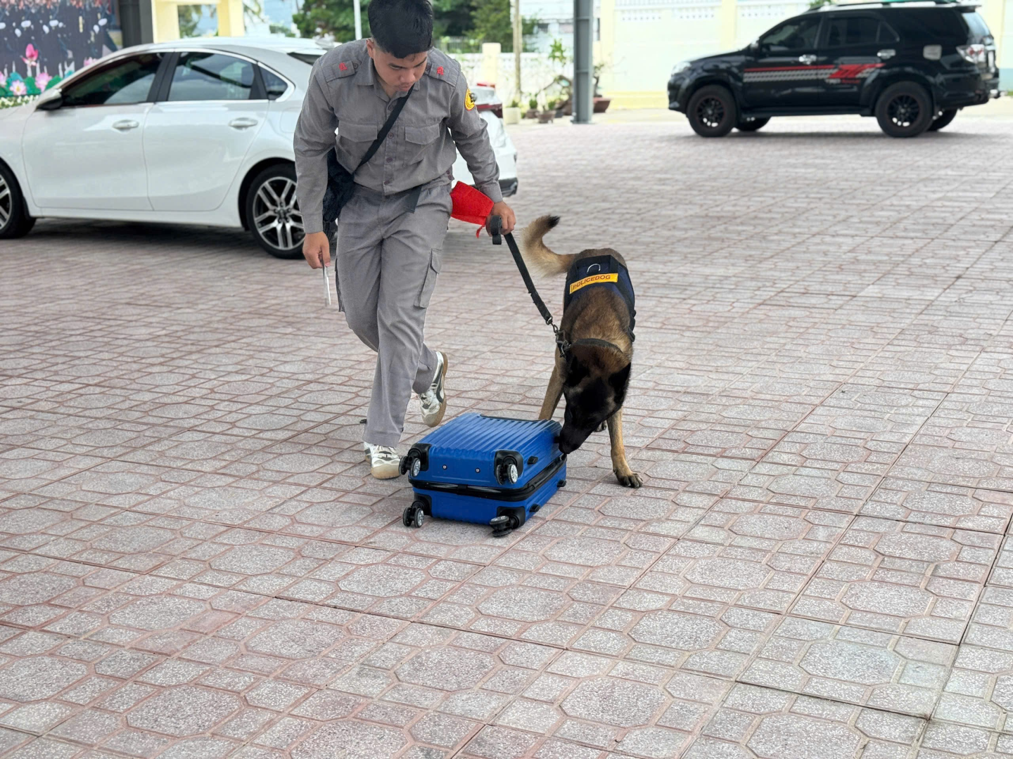 Động vật nghiệp vụ Lovely đang thực hành nhận biết bùi hơi trên hành lý