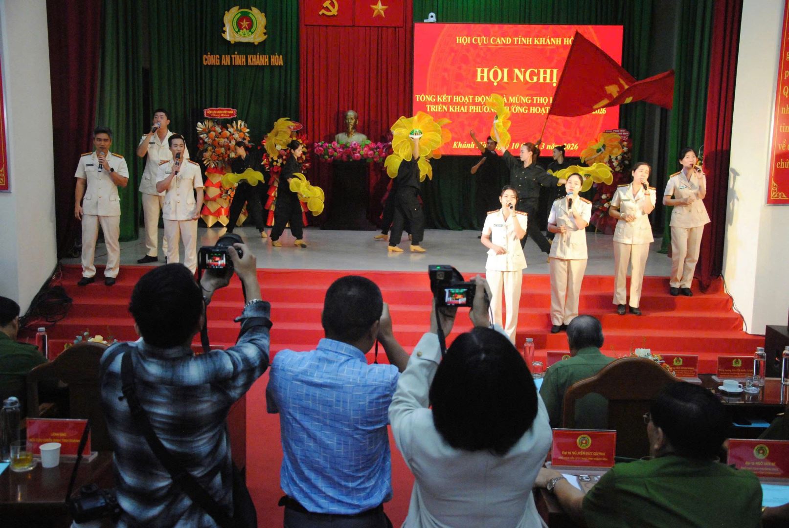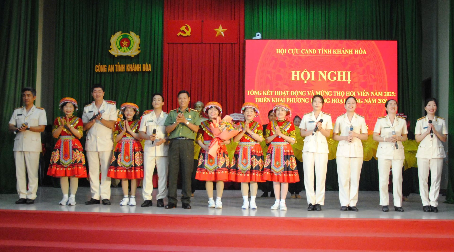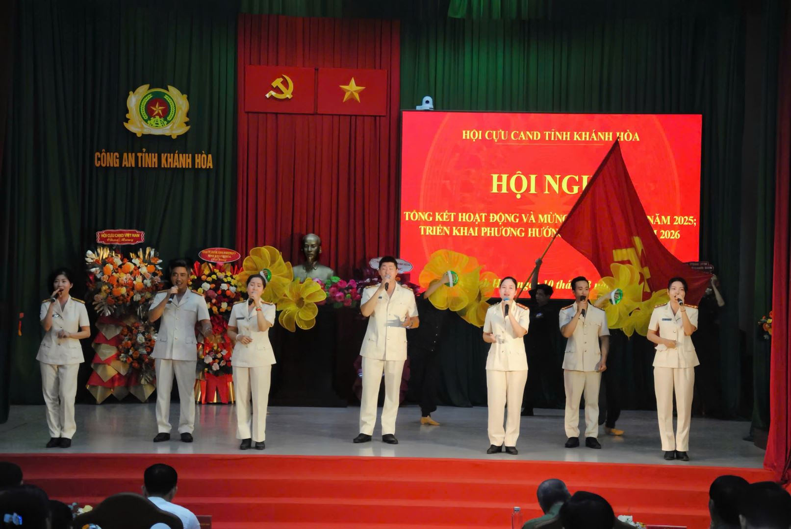 Trong bầu không khí lực lượng Công an nhân dân đang nỗ lực, chủ động, quyết liệt và phối hợp chặt chẽ của các cấp, các ngành và chính quyền cơ sở thực hiện tốt công tác bảo đảm an ninh trật tự phục vụ bầu cử, đồng thời, để chào mừng Hội nghị tổng kết công tác năm 2025, mừng thọ hội viên và triển khai công tác năm 2026 của Hội Cựu Công an nhân dân tỉnh Khánh Hòa, Đội văn nghệ Công an tỉnh đã tham mưu Chương trình văn nghệ chào mừng gồm 05 tiết mục: (1) Đơn ca nam ca khúc Nguyện thề vì Bình Yên, sáng tác: Nguyễn Văn Chung; (2) Tốp ca nữ ca khúc Những bông hoa thép, sáng tác: Mai Trâm; (3) Múa Vấn vương chợ tình; (4) Song ca nam nữ ca khúc Nhà tôi có treo một lá cờ, sáng tác: Ngọc Anh; (5) Mashup “Bài ca Công an Khánh Hòa – Thiêng liêng lời Bác – Giữ trọn lời thề”.