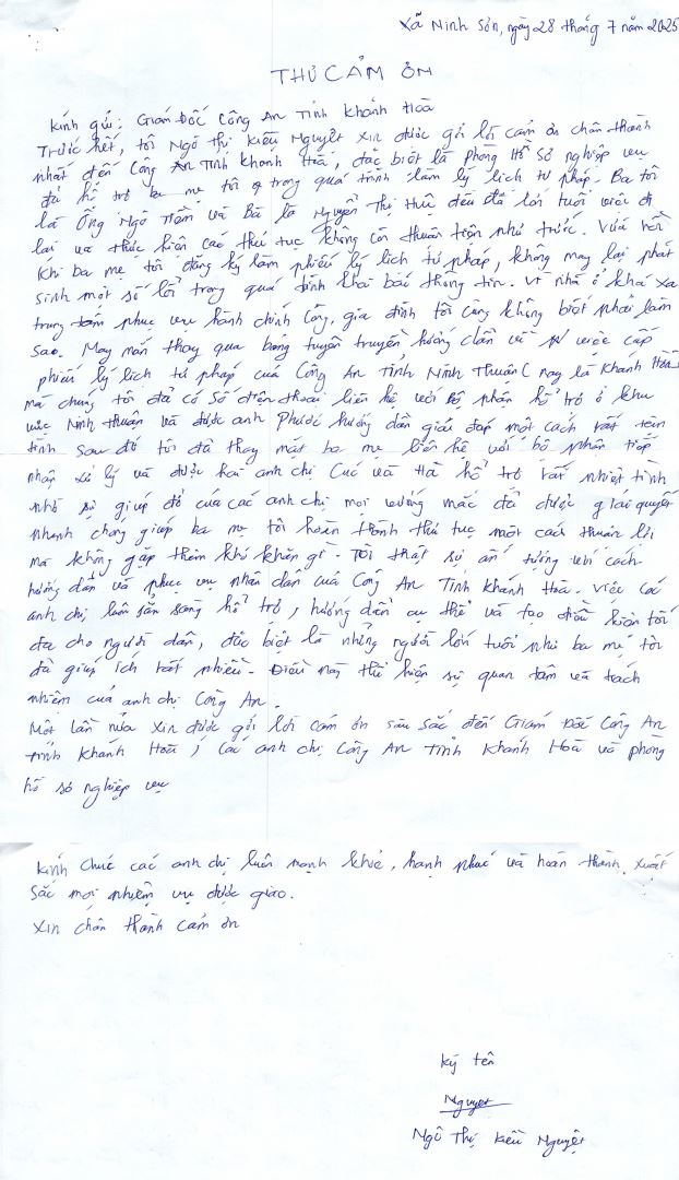 Với lòng tin đã được tạo dựng trong quá trình thực hiện dịch vụ công cấp Phiếu lý lịch tư pháp, cán bộ, chiến sỹ Phòng Hồ sơ nghiệp vụ Công an tỉnh Khánh Hòa liên tục nhận được những tin vui, những lời cảm ơn sâu sắc từ Nhân dân. Và mới đây, ngày 28 tháng 7 năm 2025 bà Ngô Thị Kiều Nguyệt (thường trú ở thôn Thạch Hà 2, xã Ninh Sơn, tỉnh Khánh Hòa - khu vực khá xa trung tâm) đã viết thư gửi lời cảm ơn đến Công an an tỉnh Khánh Hòa, Phòng Hồ sơ nghiệp vụ về những giúp đỡ tận tình của cán bộ thi hành công vụ. Chỉ trong vòng một thời gian ngắn (01 tháng sau khi sáp nhập 02 tỉnh Khánh Hòa và Ninh Thuận (cũ)), đây là lá thư cảm ơn thứ hai mà Công an tỉnh Khánh Hòa, Phòng Hồ sơ nghiệp vụ nhận được.