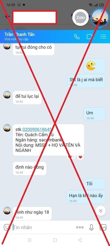 - Sinh viên cần kiểm tra các thông tin từ trường Đại học, Cao đẳng hoặc tổ chức tài chính qua các kênh chính thức và liên hệ trực tiếp với trường nếu có bất kỳ nghi ngờ nào. Tuyệt đối không thực hiện việc chuyển tiền khi tiếp nhận thông tin yêu cầu đóng lệ phí, học phí từ những kênh thông tin không chính thống của trường như qua điện thoại, tin nhắn, thư điện tử, các trang nhóm Zalo, Facebook.
