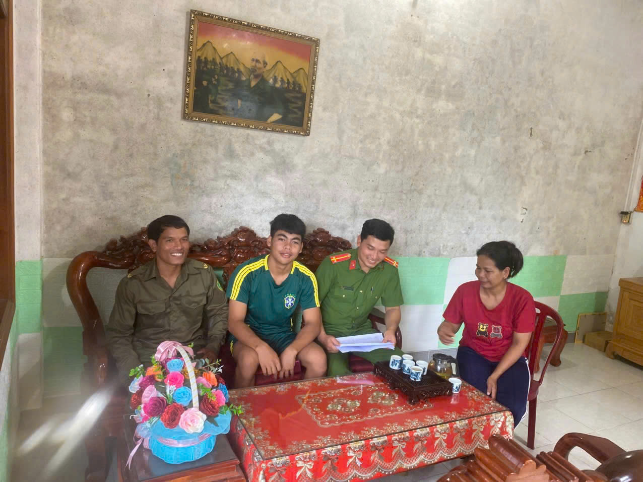 Anh Cao Huy và Công an xã tuyên truyền, vận động thanh niên trong độ tuổi thực hiện nghĩa vụ tham gia Công an nhân dân.