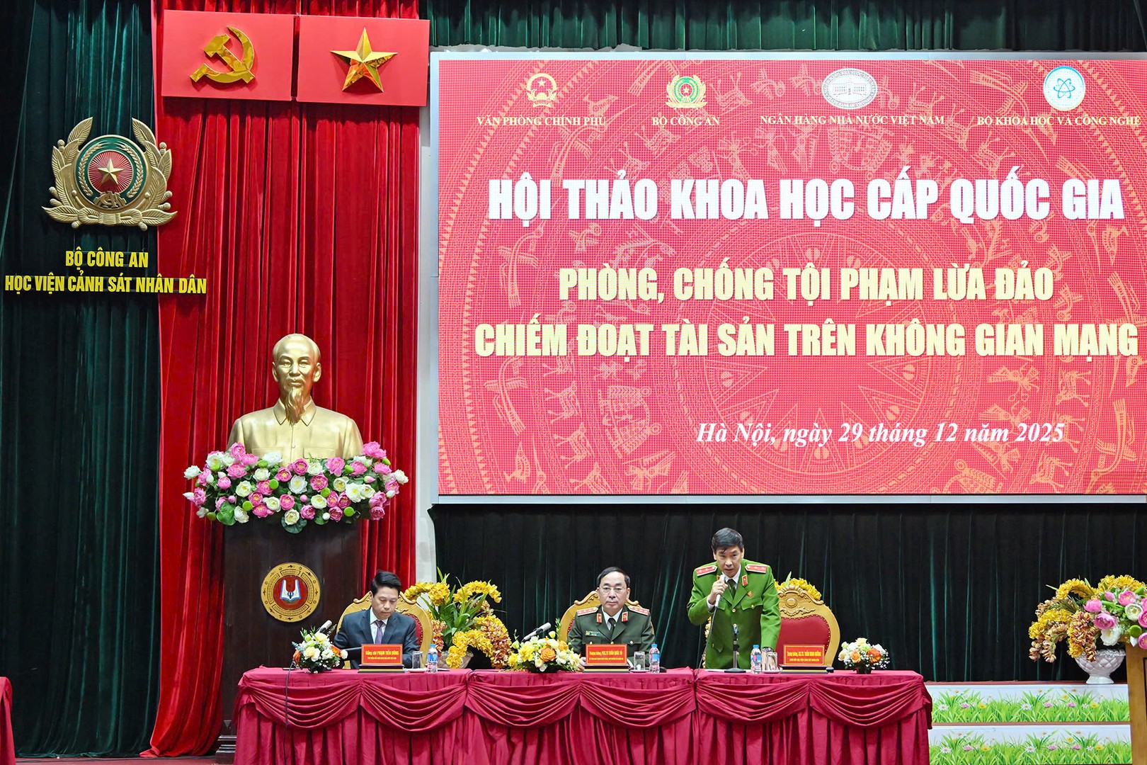 Sáng 29/12/2025, tại Hà Nội, Bộ Công an chủ trì, phối hợp với Văn phòng Chính phủ, Bộ Khoa học và Công nghệ, Ngân hàng Nhà nước Việt Nam tổ chức Hội thảo khoa học cấp Quốc gia “Phòng, chống tội phạm lừa đảo chiếm đoạt tài sản trên không gian mạng”. Thượng tướng, PGS.TS Trần Quốc Tỏ, Ủy viên Trung ương Đảng, Thứ trưởng Bộ Công an; đồng chí Phạm Tiến Dũng, Phó Thống đốc Ngân hàng Nhà nước Việt Nam đồng chủ trì Hội thảo.