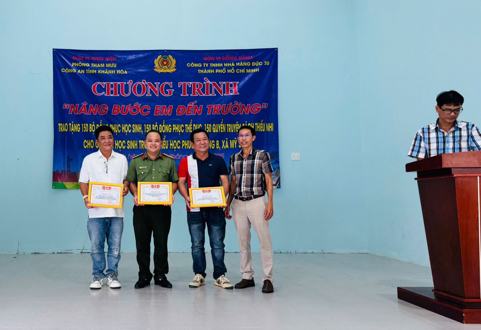 Ngày 16/8/2025, Phòng Tham mưu Công an tỉnh Khánh Hòa phối hợp với Công ty TNHH Nhà hàng Đức 30 (TP. Hồ Chí Minh) tổ chức Chương trình “Nâng bước em đến trường”; trao tặng 500 phần quà với tổng trị giá hơn 168 triệu đồng cho học sinh có hoàn cảnh khó khăn tại xã Mỹ Sơn, tỉnh Khánh Hòa.