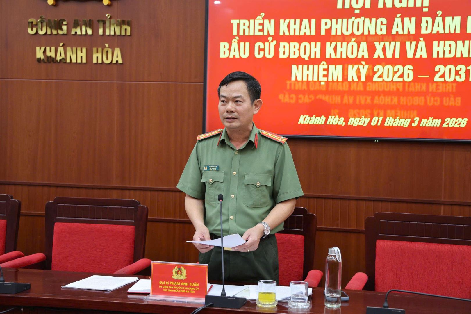 Chiều ngày 1/3, Công an tỉnh Khánh Hòa tổ chức hội nghị triển khai phương án đảm bảo an ninh trật tự (ANTT) bầu cử Đại biểu Quốc hội khóa XVI và Đại biểu Hội đồng nhân dân các cấp nhiệm kỳ 2026 – 2031. Đại tá Phạm Anh Tuấn, Phó Giám đốc Công an tỉnh chủ trì hội nghị.