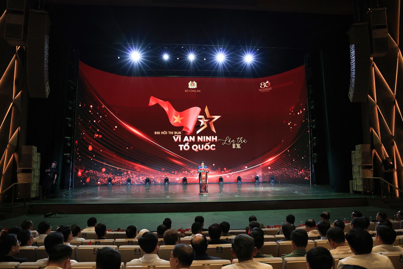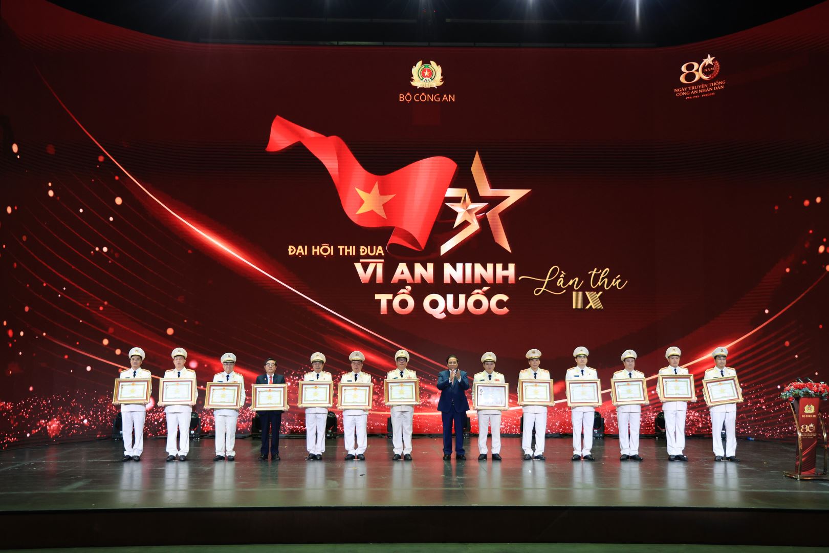 Tối 6/8, tại Hà Nội, Bộ Công an Bộ Công an long trọng tổ chức Đại hội Thi đua “Vì an ninh Tổ quốc” lần thứ IX, nhân Kỷ niệm 80 năm Ngày truyền thống lực lượng Công an nhân dân (19/8/1945-19/8/2025), 20 năm Ngày hội Toàn dân bảo vệ an ninh Tổ quốc (19/8/2005-19/8/2025), 80 năm Cách mạng Tháng Tám và Quốc khánh 2/9 (1945-2025). Đến dự và phát chỉ đạo đại hội thi đua có đồng chí: Thủ tướng Chính phủ Phạm Minh Chính, Uỷ viên Bộ Chính trị, Thủ tướng Chính phủ, Chủ tịch Hội đồng Thi đua - Khen thưởng Trung ương. Các đồng chí Nguyễn Tấn Dũng, nguyên Ủy viên Bộ Chính trị, nguyên Thủ tướng Chính phủ; Đại tướng Lê Hồng Anh, nguyên Ủy viên Bộ Chính trị, nguyên Thường trực Ban Bí thư, nguyên Bộ trưởng Bộ Công an. Đại tướng Lương Tam Quang, Ủy viên Bộ Chính trị, Bộ trưởng Bộ Công an chủ trì Đại hội. Cùng dự có các đồng chí Ủy viên Trung ương Đảng, nguyên Ủy viên Trung ương Đảng; lãnh đạo các ban, bộ, ngành, địa phương; mẹ Việt Nam Anh hùng; các đồng chí trong Đảng ủy Công an Trung ương, lãnh đạo Bộ Công an, nguyên lãnh đạo Bộ Công an; các tướng lĩnh, sĩ quan cao cấp và đội ngũ cán bộ làm công tác thi đua, khen thưởng trong CAND.