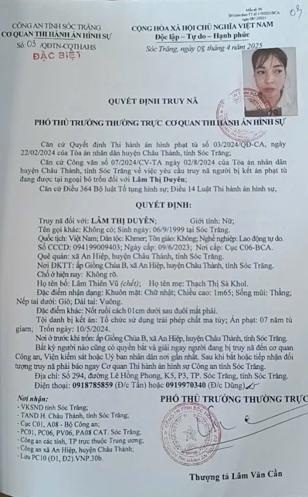 Qua công tác trao đổi thông tin và công tác quản lý địa bàn, bằng các biện pháp nghiệp vụ, chiều ngày 16/3/2026, Công an phường Cam Ranh đã phối hợp Cơ quan Thi hành án hình sự Công an thành phố Cần Thơ bắt giữ đối tượng truy nã đặc biệt nguy hiểm Lâm Thị Duyên - sinh năm 1999, trú tại xã An Hiệp, huyện Châu Thành, tỉnh Sóc Trăng (nay là xã An Ninh, TP Cần Thơ) bị truy nã về tội “Tổ chức sử dụng trái phép chất ma túy” với án phạt 7 năm tù giam (theo Quyết định truy nã của Công an thành phố Cần Thơ) khi Duyên đang lẩn trốn trên địa bàn.