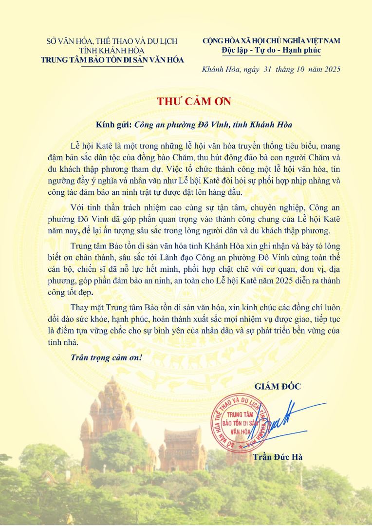 Ghi nhận tinh thần trách nhiệm cao cùng sự tận tâm chuyên nghiệp trong công tác phối hợp đảm bảo ANTT Lẽ hội Katê 2025, ngày 31/10/2025, Trung tâm bảo tồn di sản văn hóa tỉnh Khánh Hòa đã có Thư cảm ơn gửi đến Công an phường Đô Vinh và chúc cho Công an phường “tiếp tục là điểm tựa vững chắc cho sự bình yên của nhân dân và sự phát triển bền vững của tỉnh nhà”.