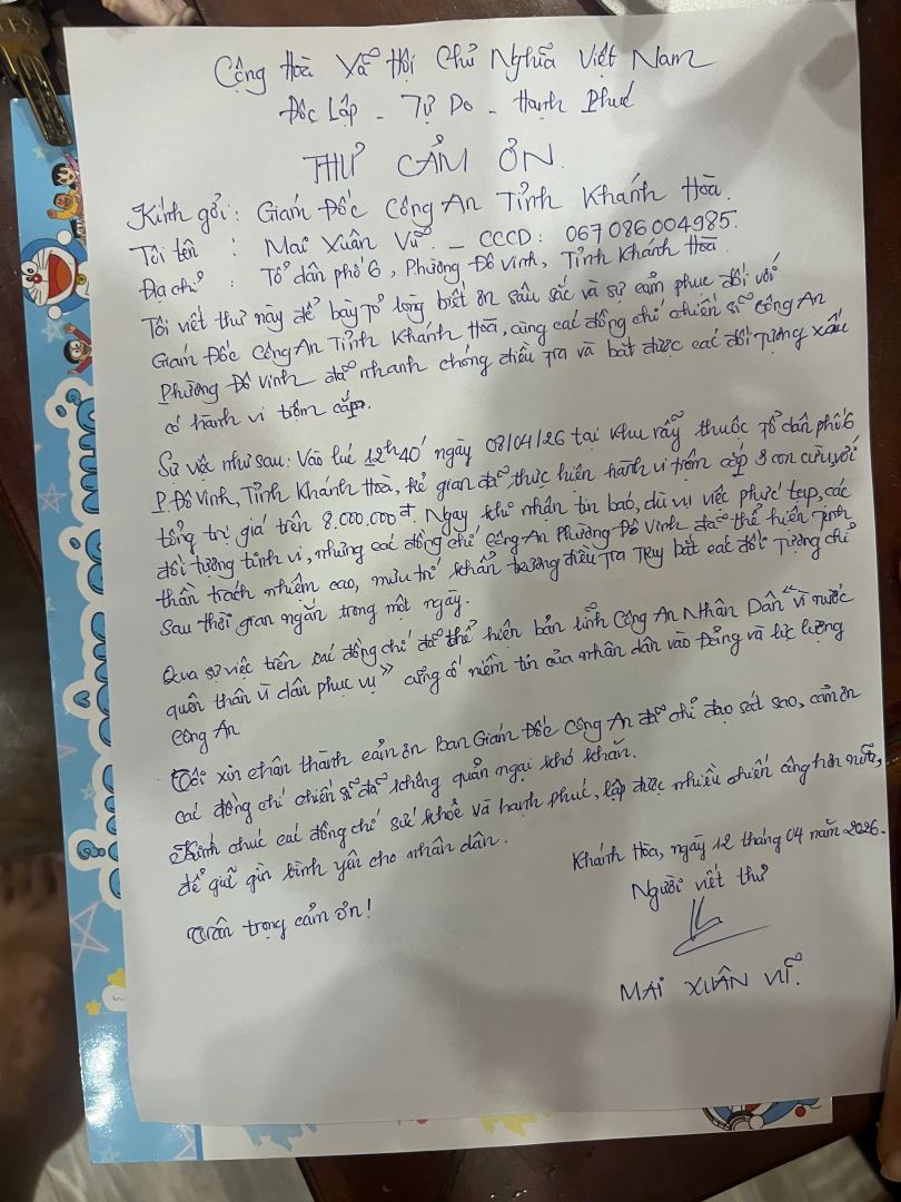 Xúc động trước tinh thần làm việc khẩn trương và tận tụy của lực lượng Công an phường, anh Mai Xuân Vũ đã viết thư cảm ơn gửi đến Giám đốc Công an tỉnh và Công an phường Đô Vinh.