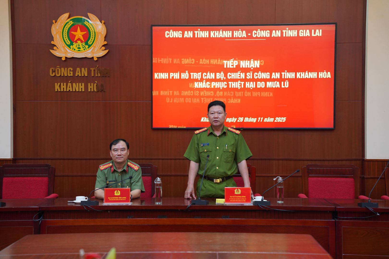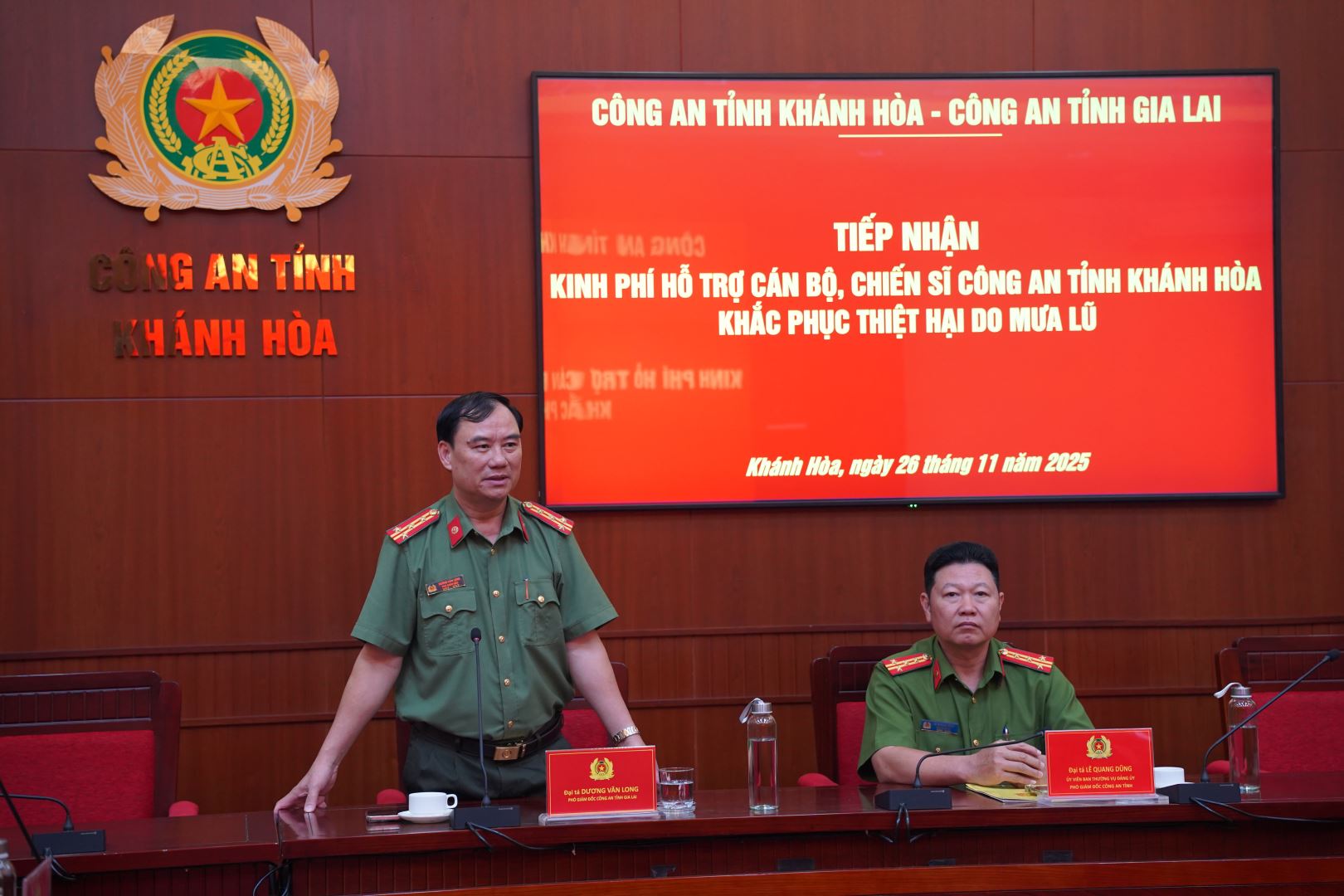 Phát biểu đáp từ, Đại tá Lê Quang Dũng – Phó Giám đốc Công an tỉnh Khánh Hòa đã thông tin nhanh về tình hình mưa lũ trên địa bàn; công tác ứng trực cứu nạn, cứu hộ và hỗ trợ nhân dân khắc phục hậu quả thiên tai của lực lượng Công an tỉnh Khánh Hòa. Đồng thời, bày tỏ xúc động trước tình cảm chân thành CBCS thực hiện nhiệm vụ và nhân dân khắc phục hậu quả thiên tai. Đây là hành động thể hiện tấm lòng “tương thân, tương ái”, “nghĩa tình đồng đội”.