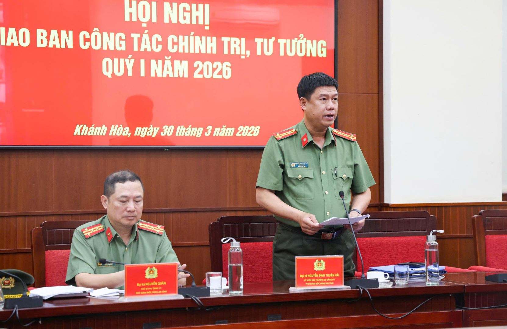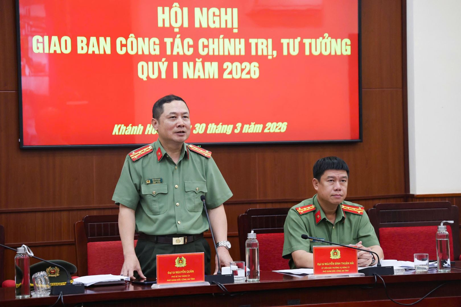 Chiều 30/3, Công an tỉnh Khánh Hoà tổ chức hội nghị giao ban công tác chính trị, tư tưởng quý I - năm 2026. Đại tá Nguyễn Quân, Phó Bí thư Đảng uỷ, Phó Giám đốc Công an tỉnh chủ trì hội nghị. Tham dự còn có Đại tá Nguyễn Đình Thuận Hải, Phó Giám đốc Công an tỉnh; lãnh đạo Công an các đơn vị, địa phương.