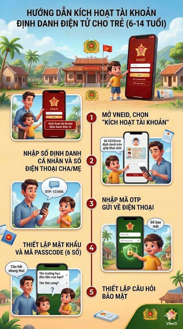 Kính đề nghị các bậc phụ huynh tích cực hưởng ứng, phối hợp chặt chẽ với lực lượng Công an trong quá trình triển khai. Việc hoàn thành mục tiêu kích hoạt định danh điện tử mức 2 cho công dân từ đủ 6 đến 14 tuổi không chỉ bảo đảm quyền lợi thiết thực cho mỗi gia đình mà còn góp phần quan trọng vào tiến trình xây dựng chính quyền số, hình thành công dân số, vì một xã hội hiện đại, minh bạch và phát triển bền vững.