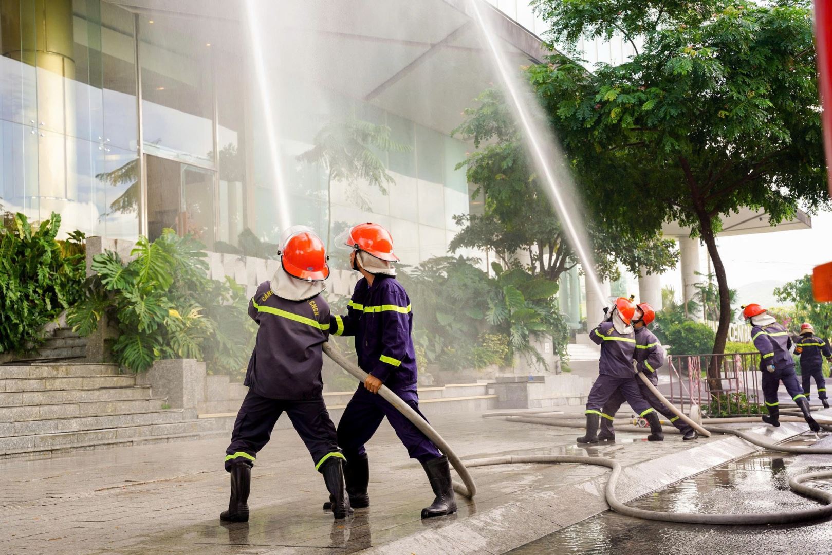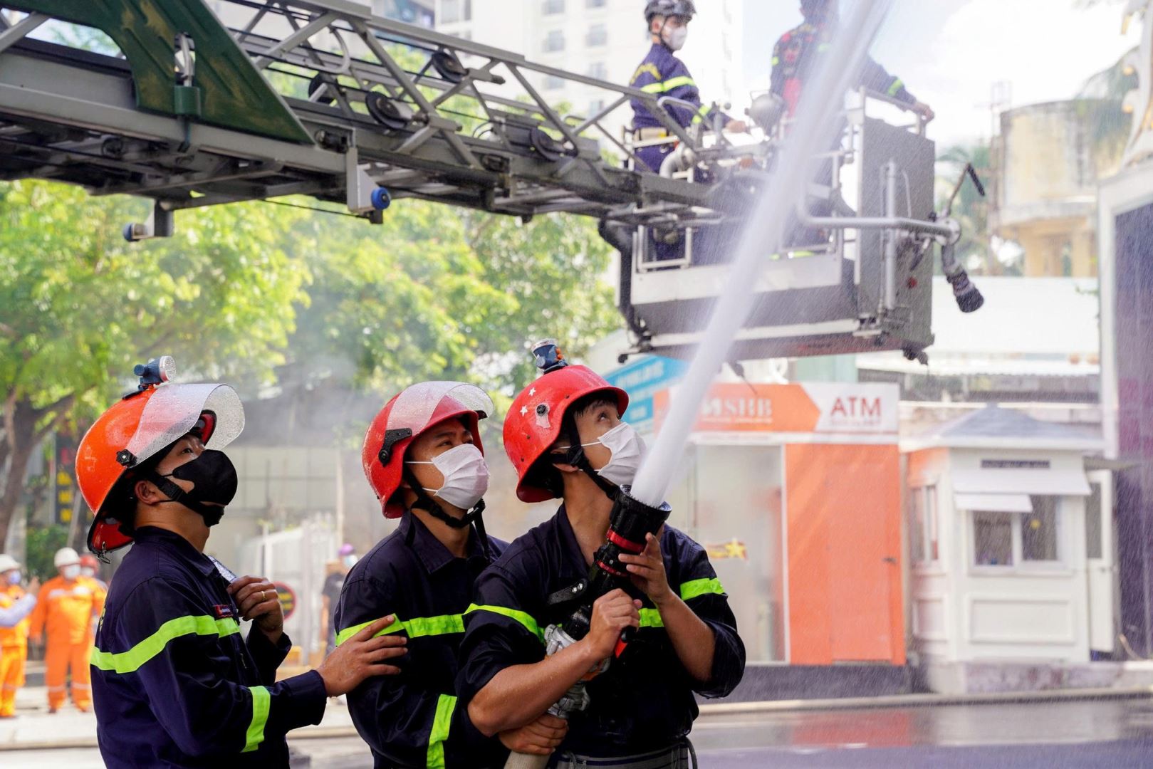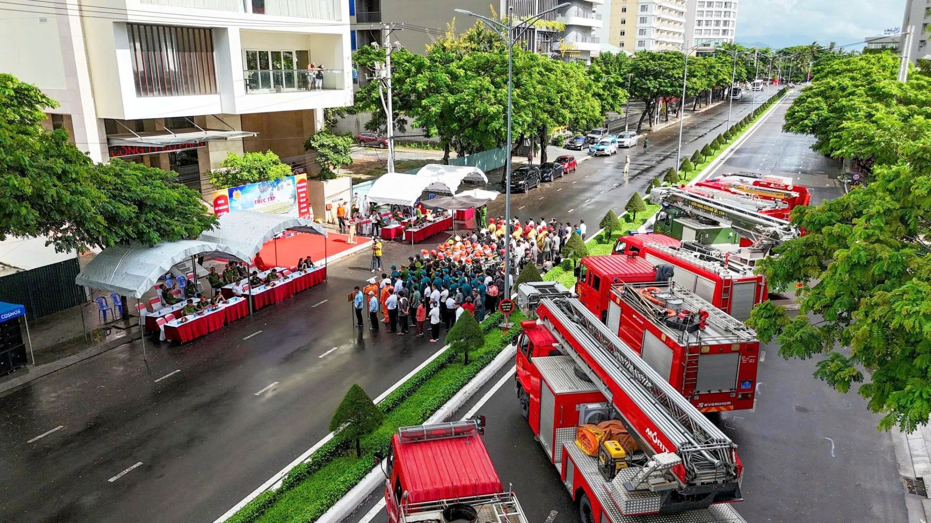Buổi diễn tập có sự tham gia của hơn 300 CBCS thuộc lực lượng vũ trang và nhân viên Khách sạn Quinter Central Nha Trang, cùng nhiều phương tiện chuyên dụng trong công tác PCCC và CNCH.