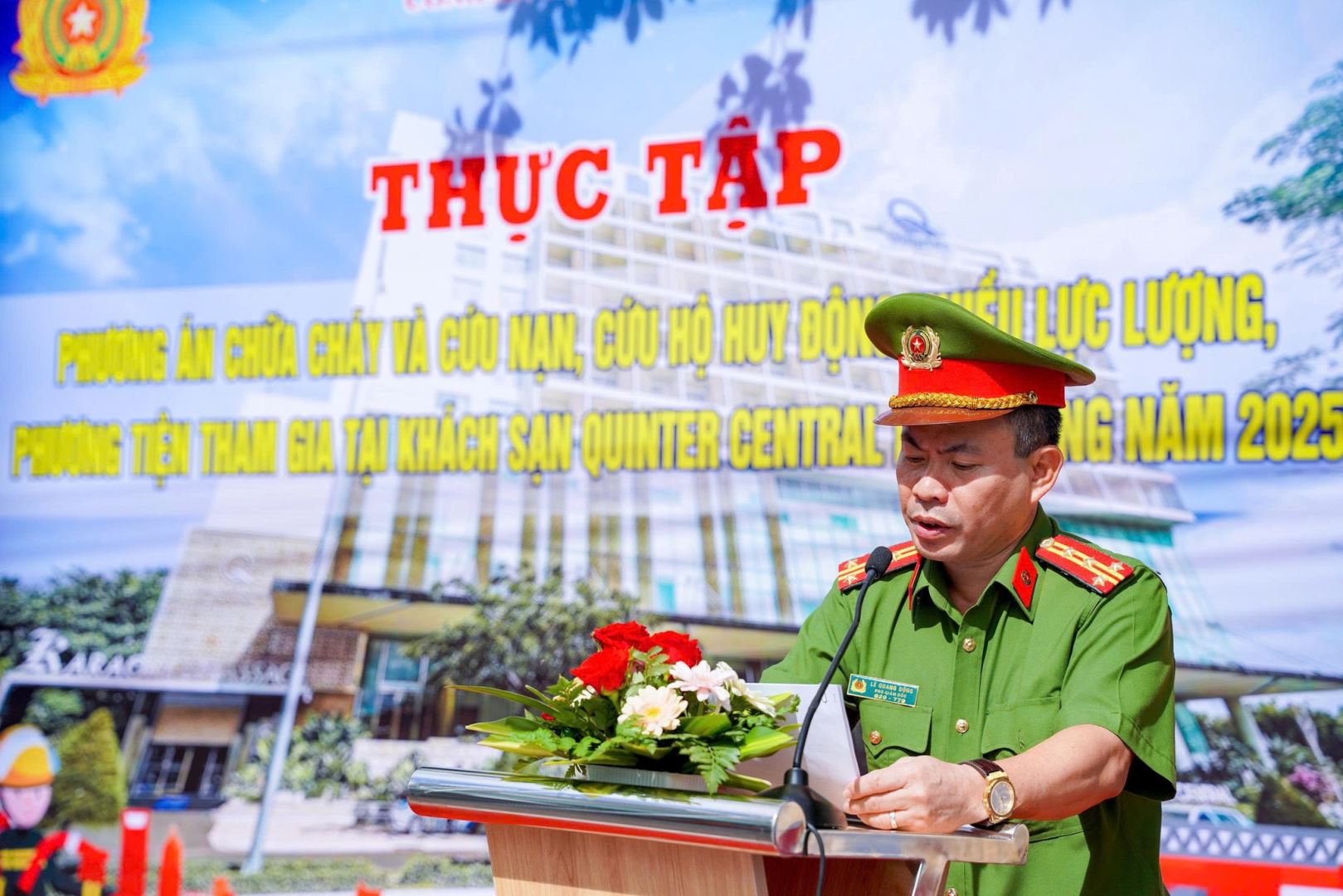 Nhằm đánh giá năng lực hiệp động và khả năng điều hành huy động phương tiện, lực lượng tham gia PCCC và CNCH, sáng 17/10, Công an tỉnh Khánh Hòa tổ chức diễn tập phương án PCCC và CNCH huy động nhiều lực lượng, phương tiện tại Khách sạn Quinter Central Nha Trang năm 2025. Đại tá Lê Quang Đồng - Phó Giám đốc Công an tỉnh dự và phát biểu chỉ đạo.