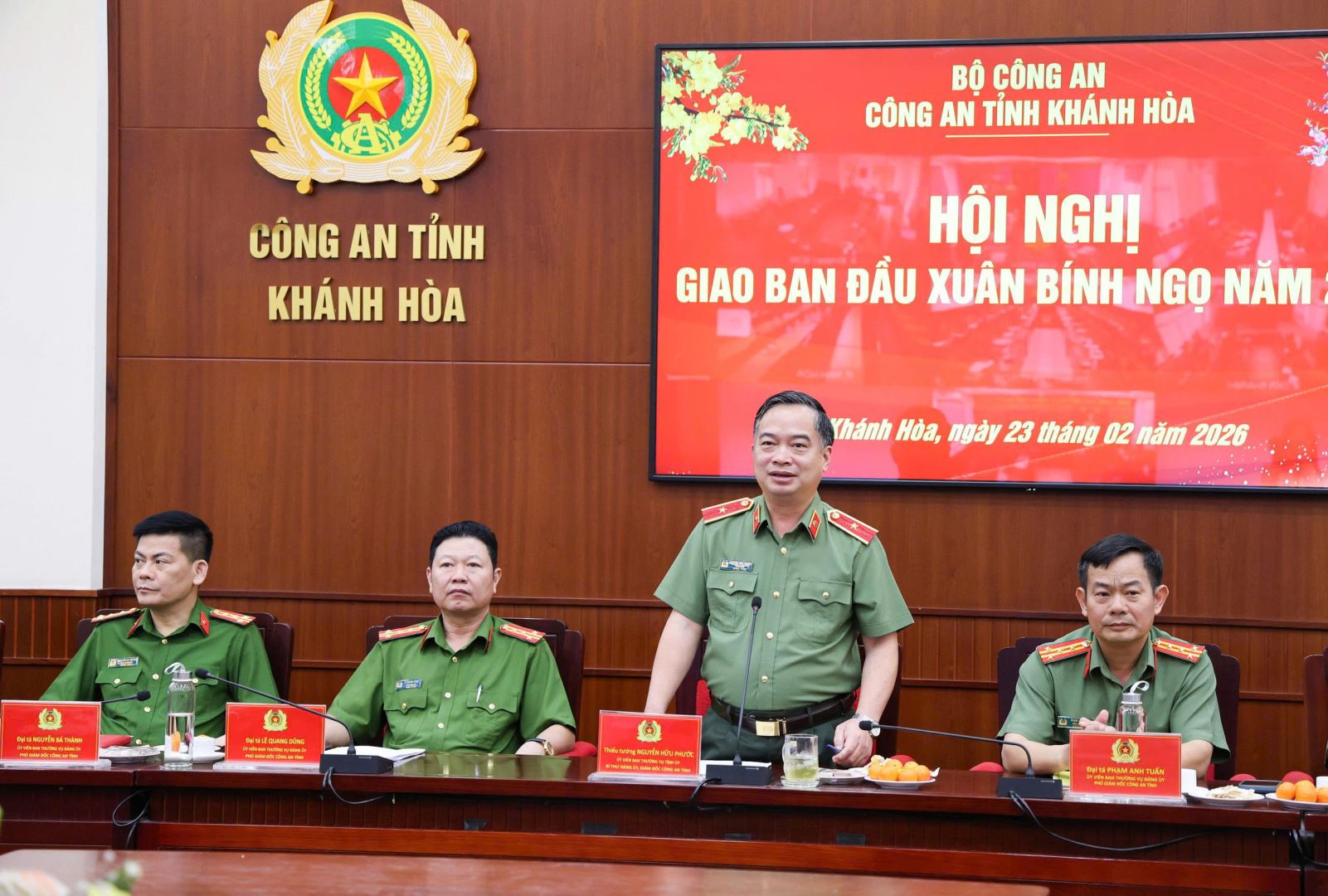 Sáng 23/2, Công an tỉnh Khánh Hòa tổ chức Hội nghị giao ban đầu xuân Bính Ngọ 2026. Hội nghị được tổ chức theo hình thức trực tiếp kết hợp trực tuyến đến Công an các xã, phường trên địa bàn tỉnh. Thiếu tướng Nguyễn Hữu Phước, Ủy viên Ban Thường vụ Tỉnh ủy, Bí thư Đảng ủy, Giám đốc Công an tỉnh chủ trì hội nghị. Tham dự hội nghị còn có các đồng chí Phó Giám đốc Công an tỉnh, lãnh đạo Công an các đơn vị, địa phương.