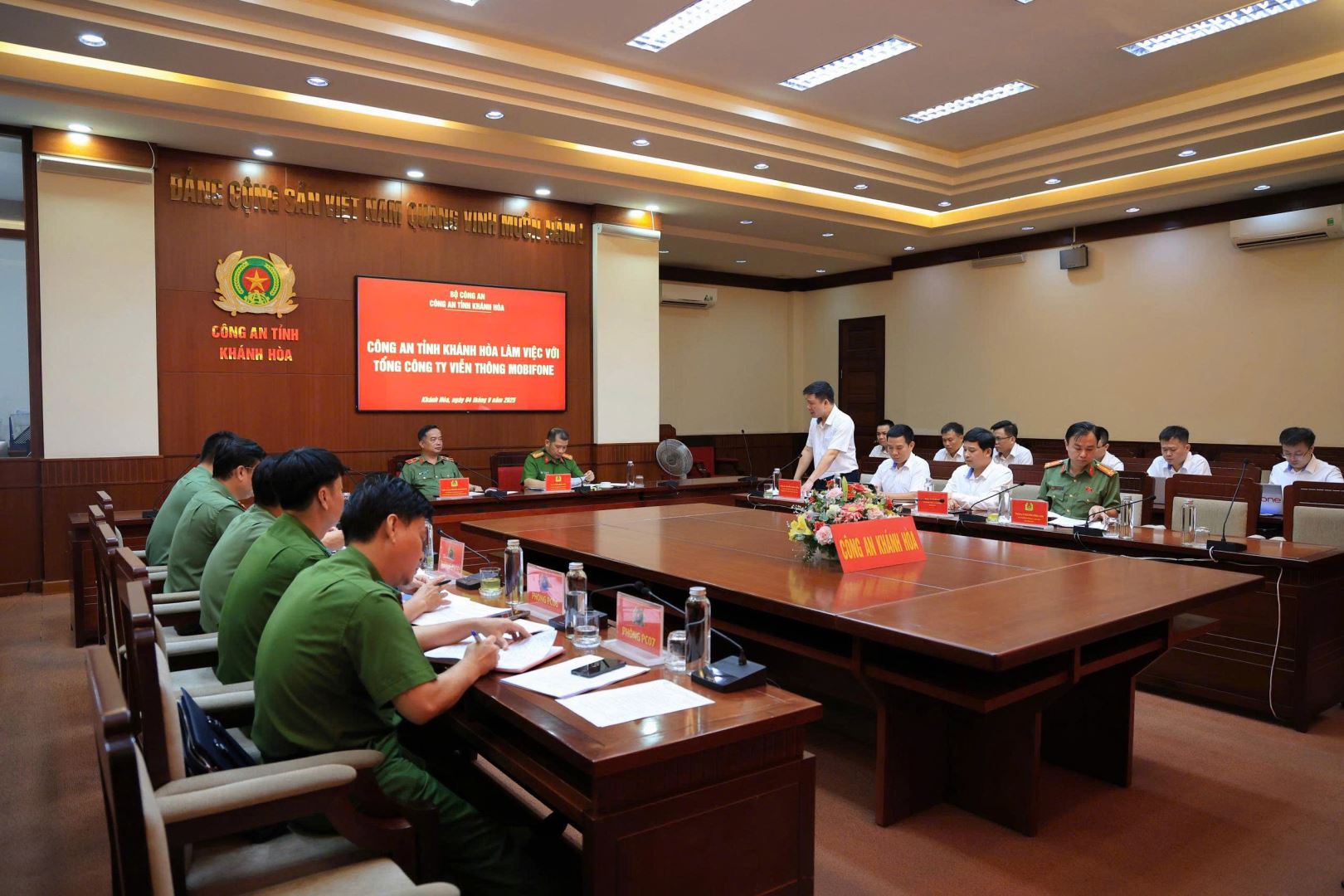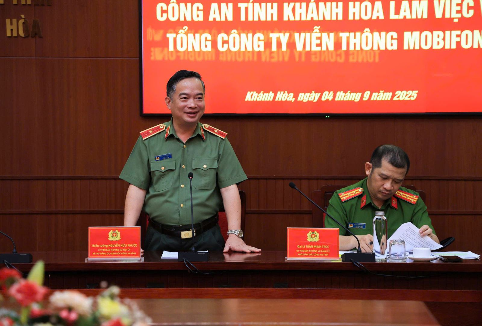 Sáng ngày 04/9, tại Khánh Hòa, Công an tỉnh Khánh Hòa đã có buổi làm việc với đại diện Tổng công ty viễn thông MobiFone về việc lựa chọn, bố trí sắp xếp cơ sở vật chất, hạ tầng phục vụ nhiệm vụ an ninh, đảm bảo mạng lưới viễn thông đáp ứng thông tin liên lạc trong Công an nhân dân. Thiếu tướng Nguyễn Hữu Phước, Ủy viên Ban thường vụ Tỉnh ủy, Bí thư Đảng ủy, Giám đốc Công an tỉnh Khánh Hòa, Ông Nguyễn Thành Công, Thành viên Hội đồng thành viên Tổng Công ty Viễn thông MobiFone tham dự chương trình. Cùng dự có đại diện Cục Quản lý xây dựng doanh trại Bộ Công an, đại diện các cơ quan chuyên môn, tham mưu giúp việc của Công an tỉnh Khánh Hòa và Tổng công ty viễn thông MobiFone.