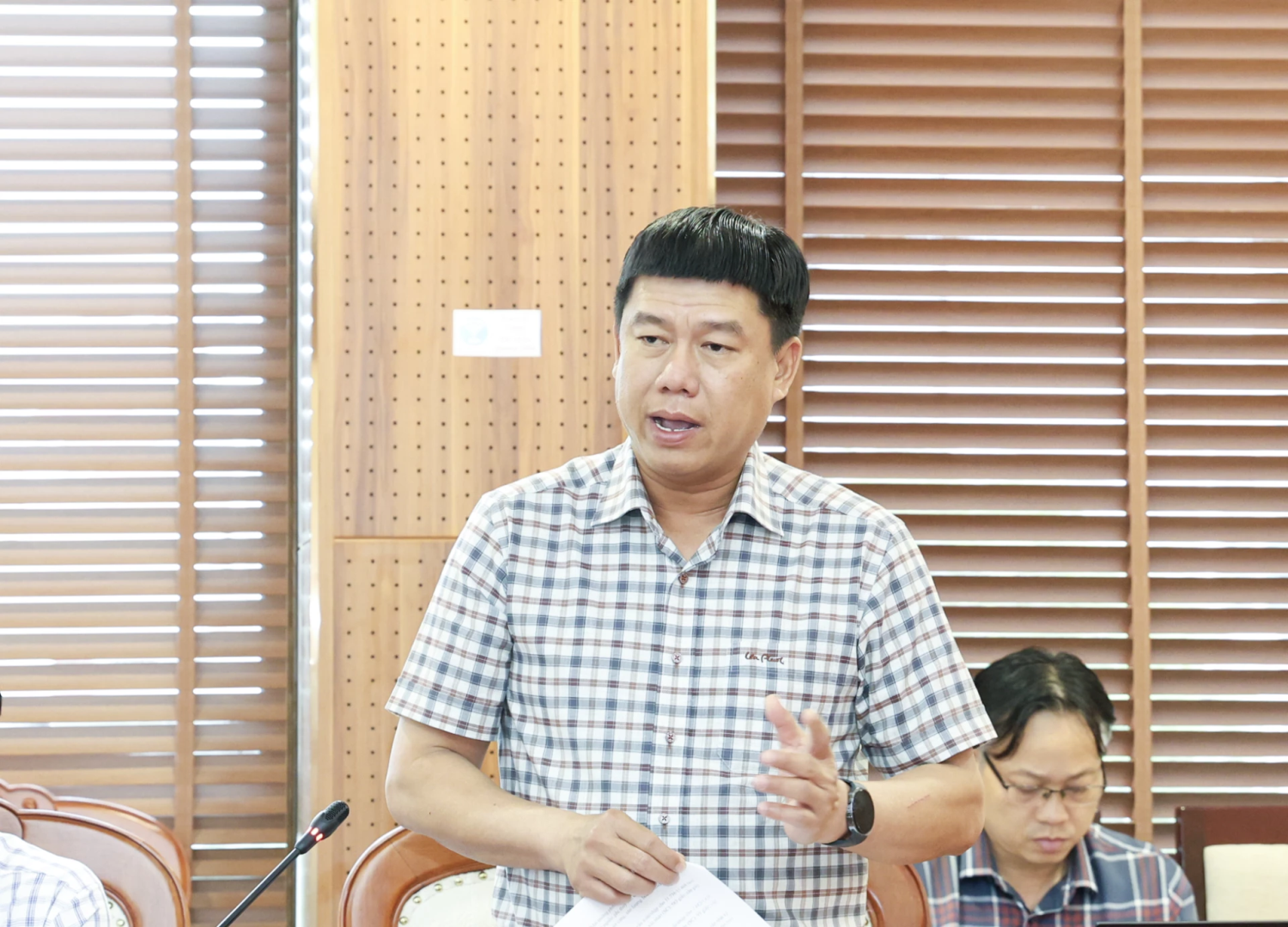 Đại tá Nguyễn Đình Thuận Hải - Phó Giám đốc Công an tỉnh báo cáo tại cuộc họp.