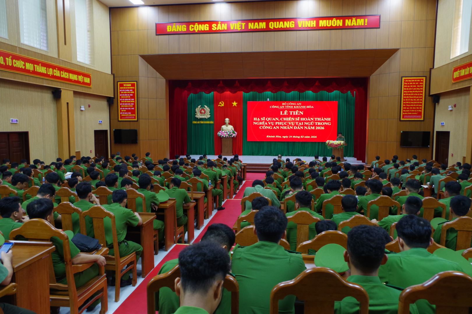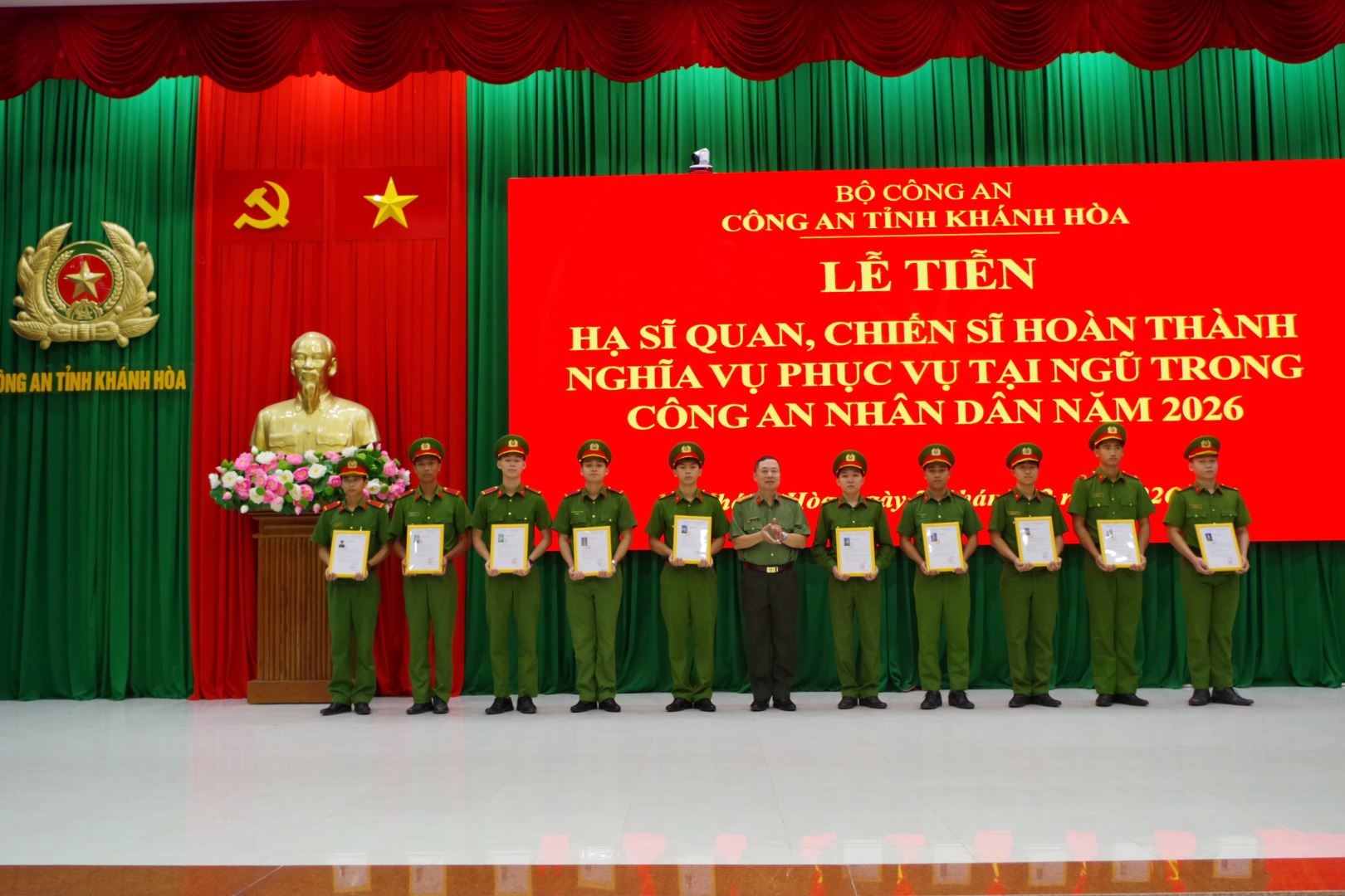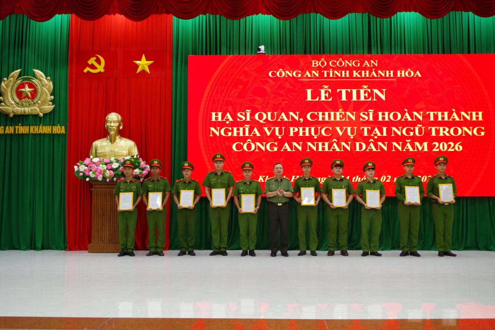 Sáng 24/2, Công an tỉnh Khánh Hòa tổ chức Lễ tiễn hạ sĩ quan, chiến sĩ nghĩa vụ hoàn thành nghĩa vụ tham gia Công an nhân dân năm 2026. Đại tá Nguyễn Quân – Phó Bí thư Đảng ủy, Phó Giám đốc Công an tỉnh chủ trì buổi lễ.