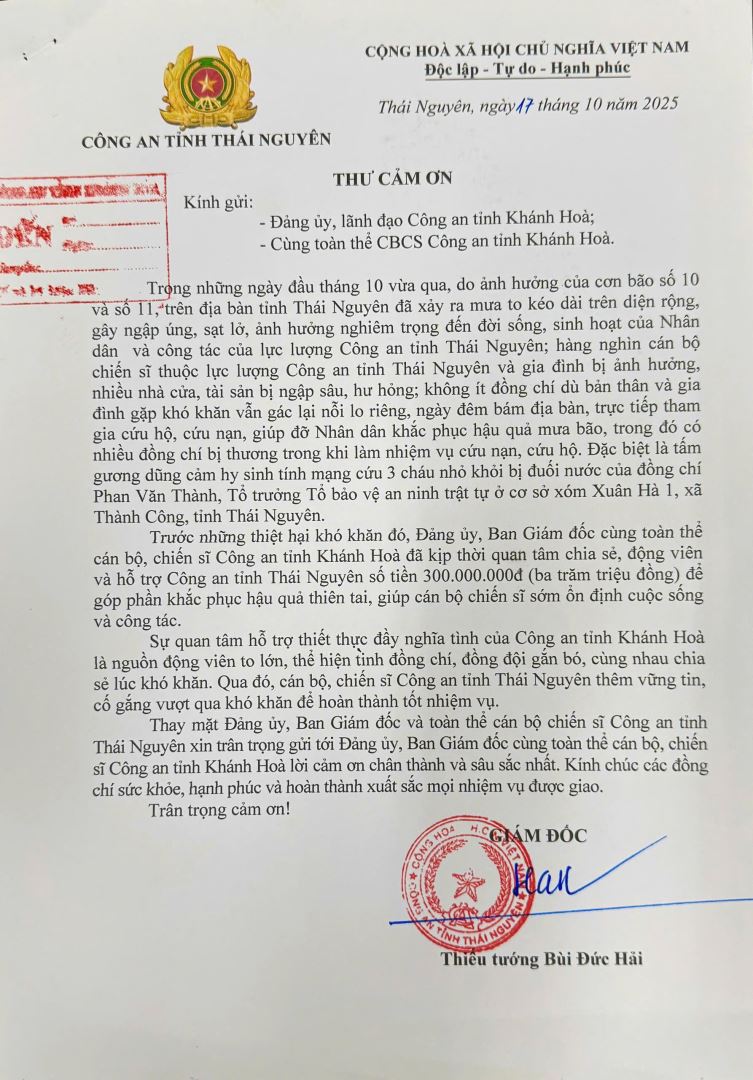 Thiếu tướng Bùi Đức Hải - Giám đốc Công an tỉnh Thái Nguyên đã có thư cảm ơn gửi tới Đảng uỷ, lãnh đạo, cùng toàn thể CBCS Công an tỉnh Khánh Hoà thể hiện sự cảm kích đến những tình cảm mà Công an Khánh Hoà dành cho nhân dân Thái Nguyên nói chung và lực lượng Công an Thái Nguyên nói riêng, trong cơn bão số 10 và số 11 vừa xảy ra trên địa bàn.