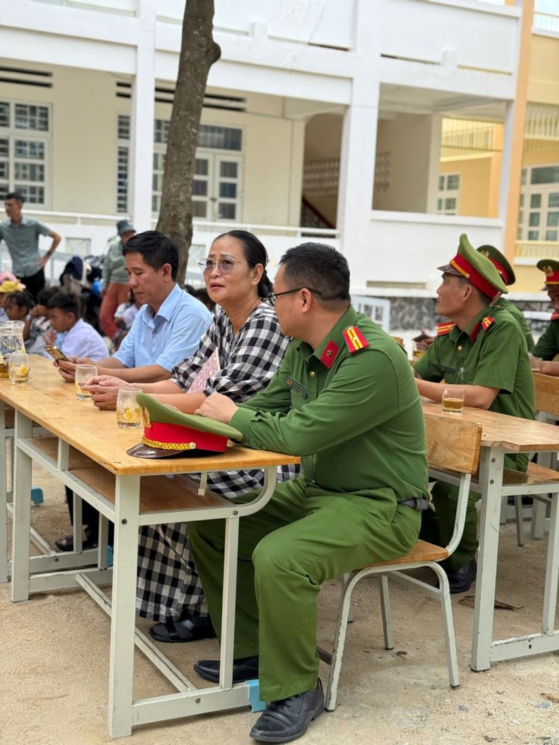 Đồng chí Thiếu tá Nguyễn Thành Phú - Trưởng Công an xã cùng nhà tài trợ và Ban Giám hiệu nhà trường trao quà cho các em học sinh