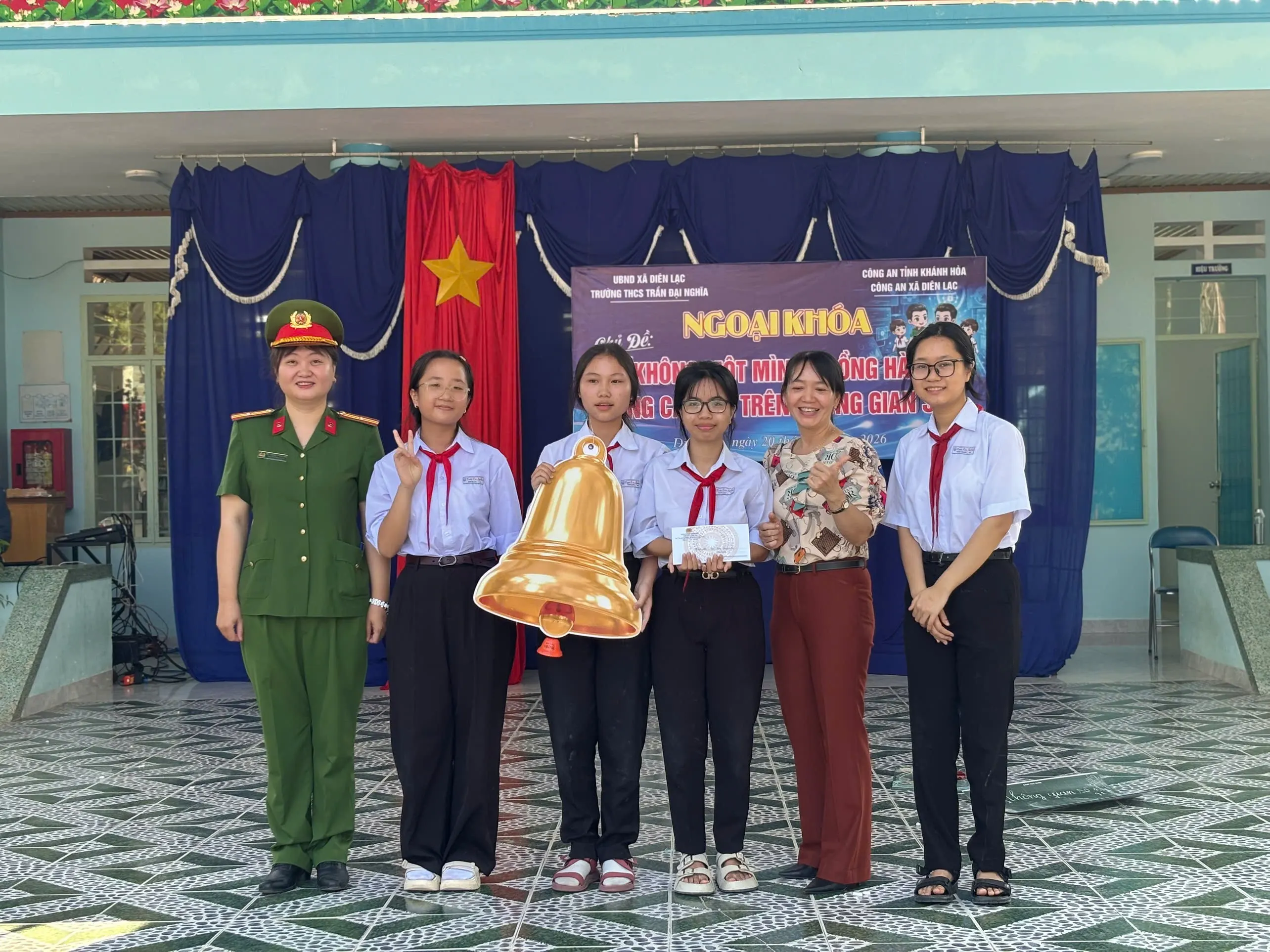 Sáng ngày 20/03/2026, Công an xã Diên Lạc phối hợp cùng Trường THCS Trần Đại Nghĩa tổ chức Hội thi Rung chuông vàng với chủ đề “Không một mình - Đồng hành cùng các em trong không gian số”. Hội thi đã thu hút sự tham gia sôi nổi của hơn 200 học sinh và cán bộ giáo viên thuộc trường Trung học cơ sở Trần Đại Nghĩa.