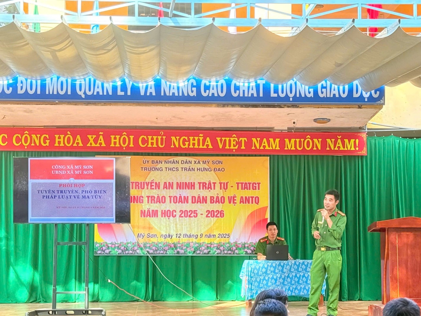 Sáng ngày 15/9/2025, Công an xã Mỹ Sơn đã phối hợp với Trường THCS Trần Hưng Đạo tổ chức tuyên truyền, phổ biến pháp luật, hướng dẫn kỹ năng tham gia giao thông an toàn; phòng, chống tội phạm, ma túy, bạo lực học đường cho toàn thể cán bộ, giáo viên và học sinh của nhà trường. Đến dự buổi tuyên truyền có các đồng chí lãnh đạo Công an xã Mỹ Sơn và Ban Giám hiệu Trường THCS Trần Hưng Đạo.