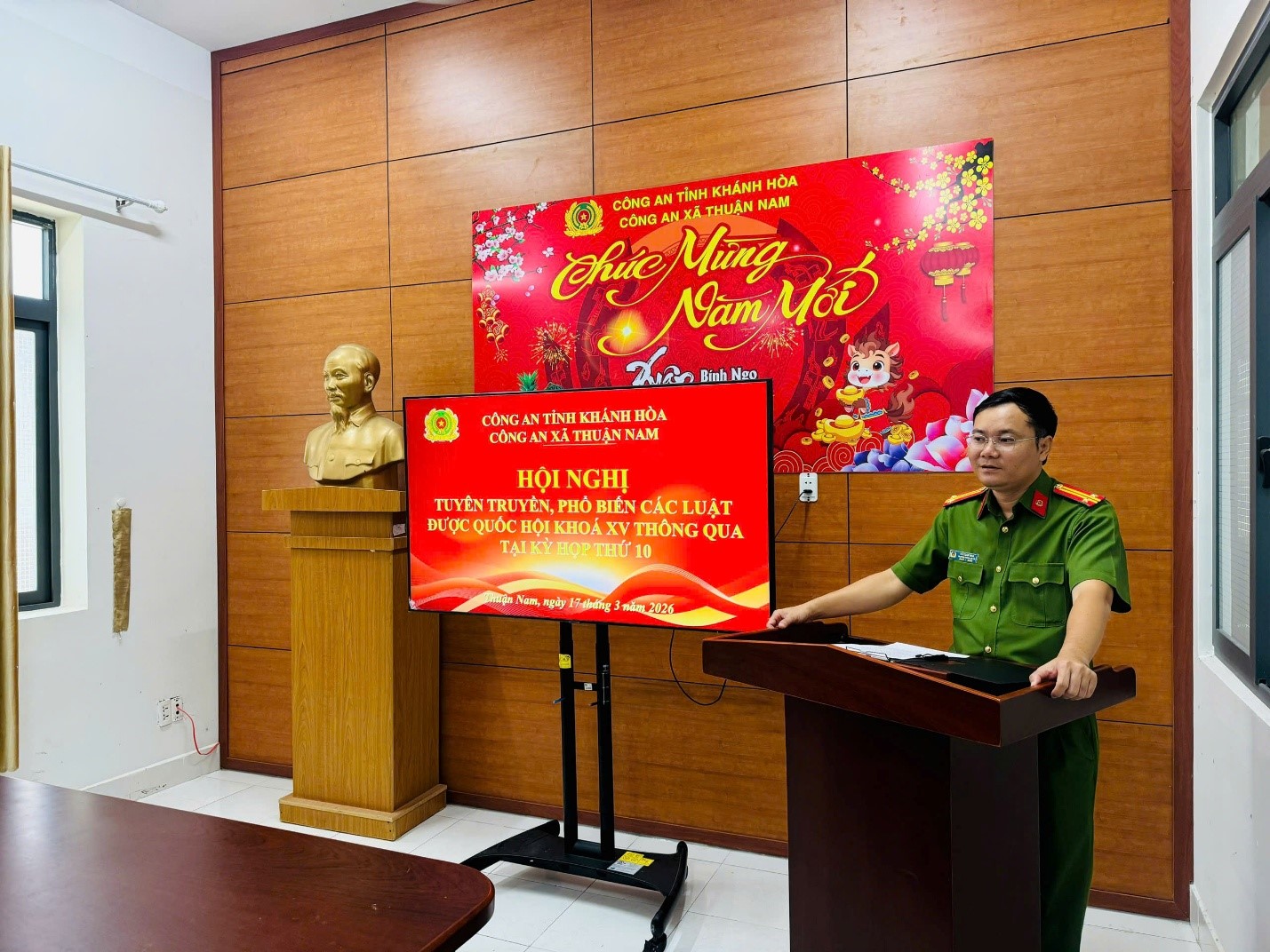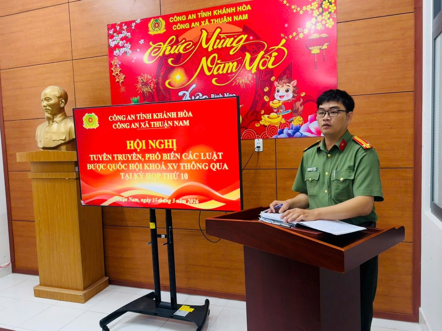 Nhằm tiếp tục triển khai thực hiện tốt, có hiệu quả công tác phổ biến, giáo dục pháp luật đối với cán bộ, chiến sĩ Công an xã, trên cơ sở chỉ đạo của Công an tỉnh về tiếp tục thực hiện công tác phổ biến, giáo dục pháp luật trong Công an tỉnh Khánh Hòa năm 2026; sáng ngày 17/3, Công an xã Thuận Nam tổ chức Hội nghị tuyên truyền, phổ biến các Luật được Quốc hội khóa XV thông qua tại Kỳ họp thứ 10. Tham dự và chủ trì Hội nghị có đồng chí Trung tá Vũ Xuân Hòa - Bí thư Đảng ủy, Trưởng Công an xã cùng toàn thể chỉ huy, cán bộ chiến sĩ Công an xã.