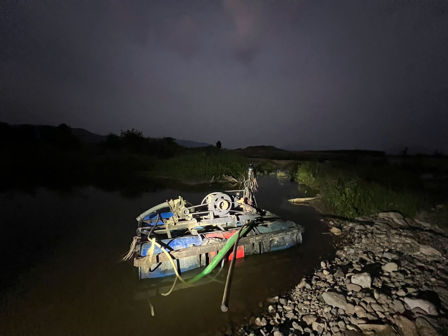 Cụ thể, vào lúc 16 giờ 45 phút ngày 11/4/2026, trong quá trình tuần tra kiểm soát tại khu vực dọc lòng sông Chò, Tổ tuần tra Công an xã Trung Khánh Vĩnh phát hiện 01 phà máy tự chế đang có hành vi bơm hút cát từ lòng sông lên 03 xe ô tô tải đang đậu đỗ sát bờ sông.