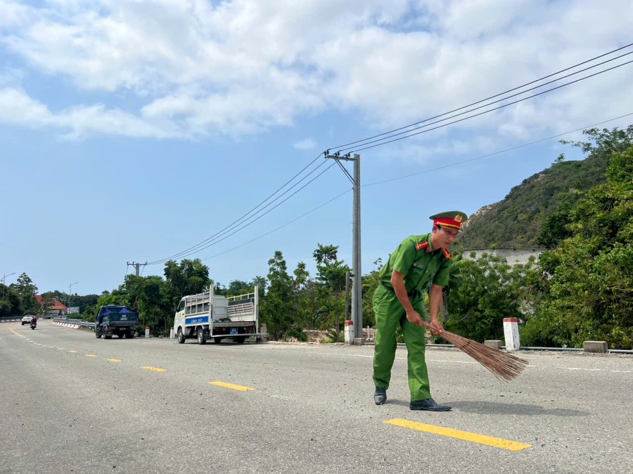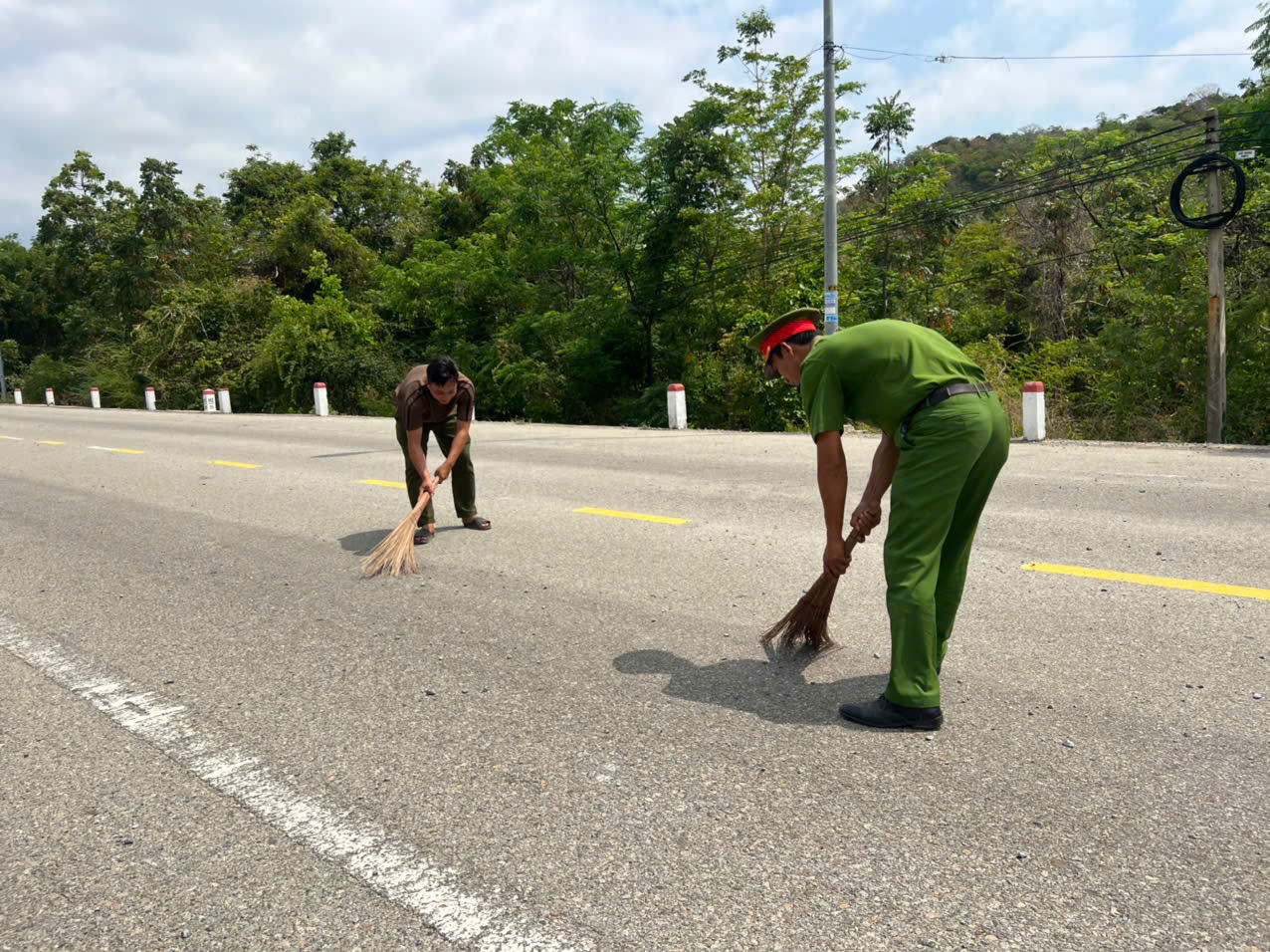 Ngay sau khi phát hiện sự việc, Công an xã Vĩnh Hải đã nhanh chóng có mặt tại hiện trường, kịp thời nắm tình hình; đồng thời huy động cán bộ, chiến sĩ Công an xã, lực lượng tham gia bảo vệ an ninh, trật tự ở cơ sở cùng sự chung tay hỗ trợ của quần chúng Nhân dân địa phương triển khai các biện pháp khắc phục. Với tinh thần trách nhiệm cao, không quản ngại khó khăn, các lực lượng đã sử dụng các dụng cụ thô sơ như chổi, xẻng… tiến hành quét, thu gom toàn bộ số đá dăm rơi vãi trên mặt đường.