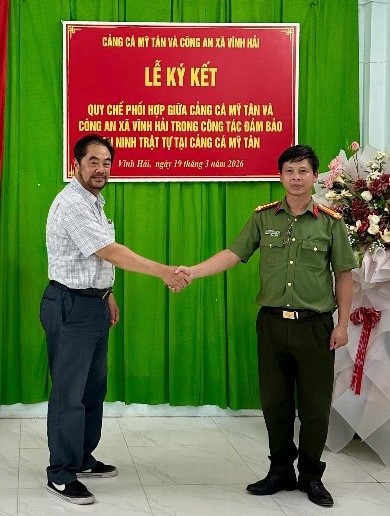 Chiều ngày 19/3/2026, Công an xã Vĩnh Hải và Cảng cá Mỹ Tân tổ chức Lễ ký kết Quy chế phối hợp đảm bảo an ninh trật tự Cảng cá Mỹ Tân. Tham dự buổi Lễ có đồng chí Trần Phi Mang - Phó Chủ tịch UBND xã, đại diện lãnh đạo, cán bộ, chiến sĩ Công an xã và đại diện lãnh đạo, nhân viên Cảng cá Mỹ Tân; đại diện một số phòng, ban, ngành của xã, Ban Quản lý thôn, lực lượng tham gia bảo vệ an ninh trật tự thôn Mỹ Tân 1 và thôn Mỹ Tân 2.