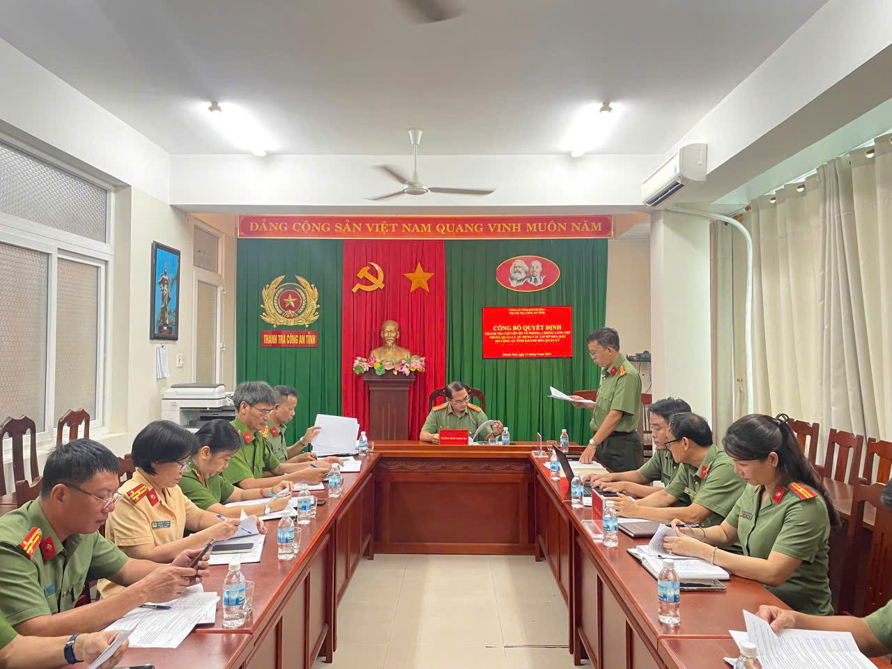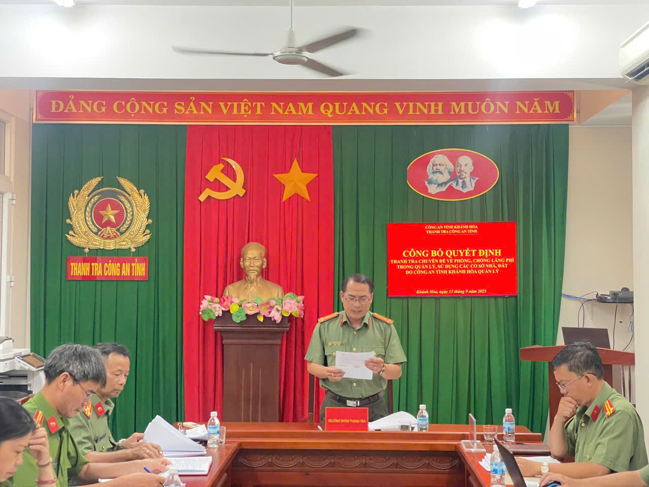 Thực hiện ý kiến chỉ đạo của Lãnh đạo Công an tỉnh về việc triển khai Kế hoạch của Bộ Công an và Văn bản của Thanh tra Bộ Công an, Thanh tra Công an tỉnh chủ trì phối hợp Phòng Hậu cần thành lập Đoàn thanh tra do đồng chí Thượng tá Nguyễn Văn Hiếu - Phó Chánh Thanh tra làm Trưởng đoàn tiến hành thanh tra chuyên đề “Phòng, chống lãng phí trong quản lý, sử dụng các cơ sở nhà, đất do Công an tỉnh quản lý” đối với 05 đơn vị Công an cấp phòng: Hậu Cần, Cảnh sát chữa cháy và cứu nạn, cứu hộ, Cảnh sát giao thông, Trại tạm giam số 01, Trại tạm giam số 02 và 06 đơn vị Công an cấp xã: Nha Trang, Ninh Hòa, Diên Khánh, Bảo An, Ninh Sơn, Thuận Nam.