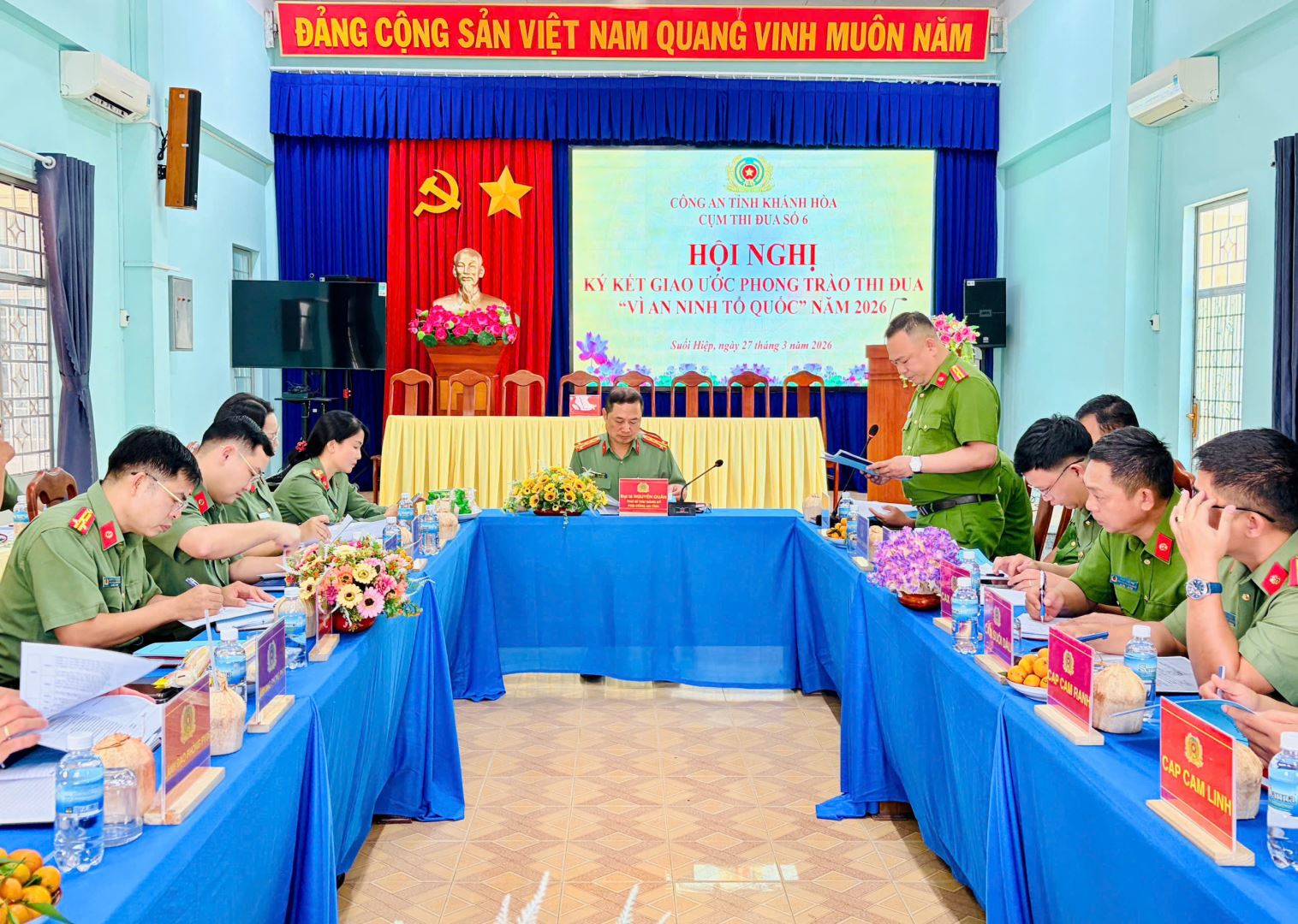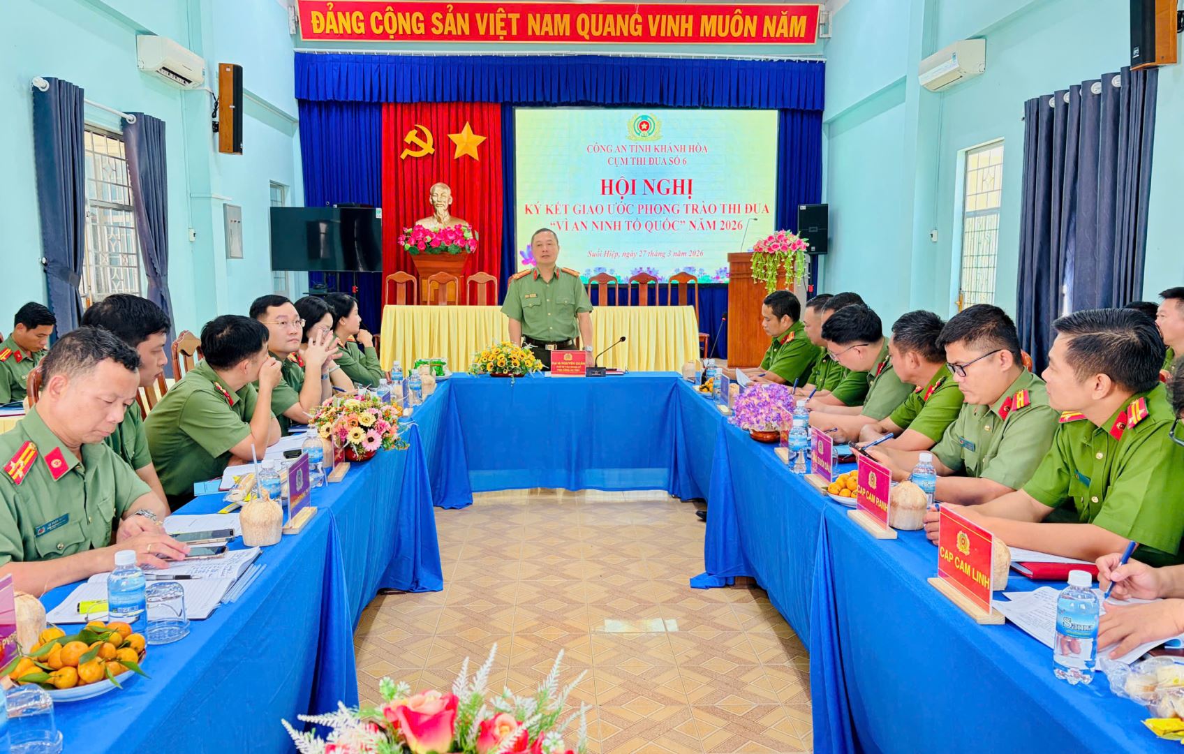 Chiều ngày 27/3, Cụm thi đua số 6 trực thuộc Công an tỉnh Khánh Hòa đã tổ chức Hội nghị ký kết giao ước phong trào thi đua "Vì an ninh Tổ quốc" năm 2026. Đại tá Nguyễn Quân, Phó Bí thư Đảng ủy, Phó Giám đốc Công an tỉnh đến dự và chỉ đạo Hội nghị.