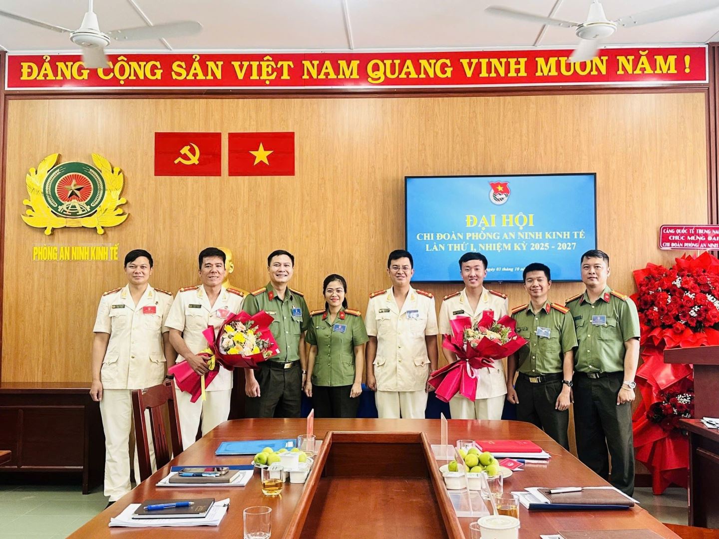 Các đại biểu chụp hình lưu niệm cùng BCH Chi đoàn Phòng An ninh kinh tế nhiệm kỳ 2025 - 2027