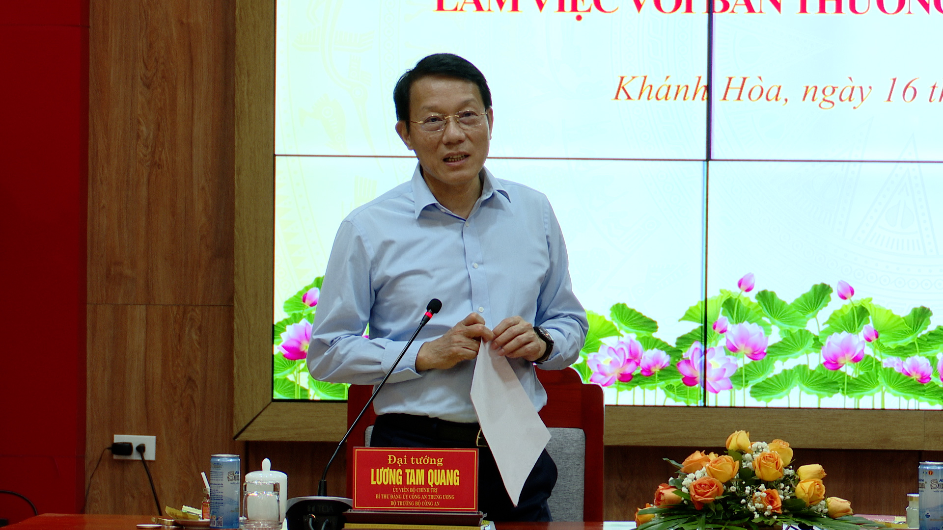 Phát biểu tại buổi làm việc, Đại tướng Lương Tam Quang, Bộ trưởng Bộ Công an, đánh giá cao kết quả KT-XH và ANTT của Khánh Hòa trong thời gian qua. Bộ trưởng Bộ Công an nhấn mạnh sẽ tiếp tục chỉ đạo các đơn vị của Bộ Công an đồng hành, phối hợp tốt với tỉnh với tinh thần “kiến tạo, đồng hành hỗ trợ, tối đa cho phát triển”. Bộ trưởng đề nghị Ban Thường vụ Tỉnh ủy Khánh Hòa bám sát, triển khai hiệu quả các nghị quyết quan trọng của Bộ Chính trị, đặc biệt là các Nghị quyết về khoa học, công nghệ, chuyển đổi số (Nghị quyết 57), hội nhập quốc tế (Nghị quyết 59), phát triển kinh tế tư nhân (Nghị quyết 68) và đổi mới công tác xây dựng pháp luật (Nghị quyết 66). Bộ trưởng cũng nhấn mạnh cần thực hiện nghiêm quan điểm của Đảng “lấy phát triển để ổn định và lấy ổn định để phát triển”, điểm của Đảng “lấy phát triển để ổn định và lấy ổn định để phát triển”, chú trọng đảm bảo tuyệt đối về an ninh đối ngoại, an ninh nội địa, an ninh kinh tế; tập trung chỉ đạo triển khai hiệu quả các giải pháp phòng ngừa, kéo giảm tội phạm; xây dựng xã, phường không ma túy…