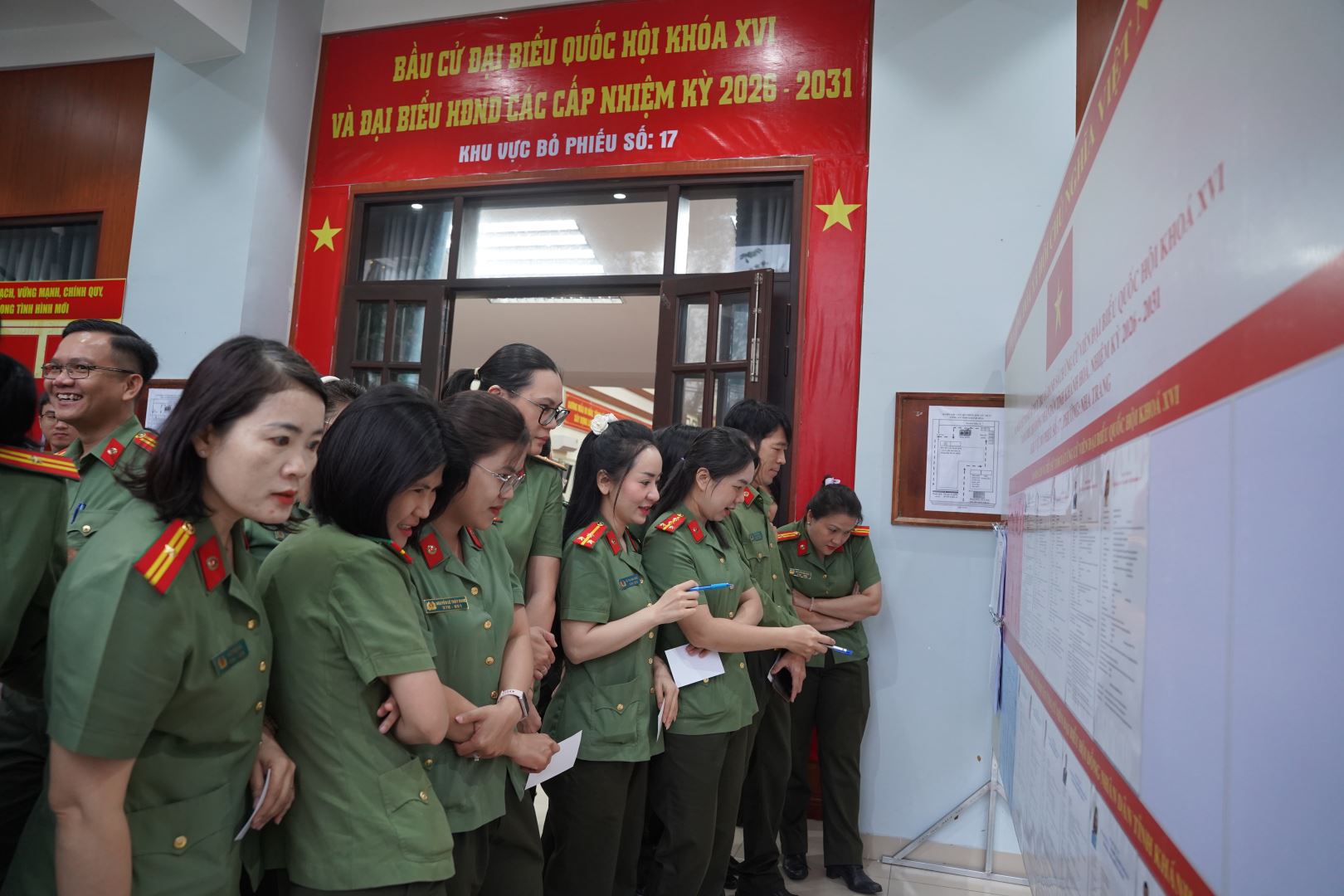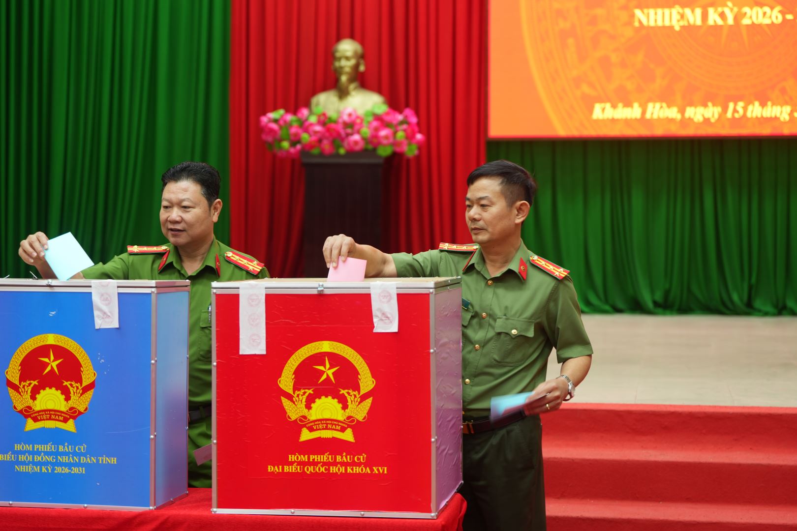 Điểm bầu cử Đại biểu Quốc hội khóa XVI và đại biểu HĐND các cấp nhiệm kỳ 2026 - 2031 tại Công an tỉnh Khánh Hòa có 601 cử tri tham gia bầu cử. Ngay sau nghi Lễ chào cờ, nghi thức khai mạc cuộc bầu cử, công tác kiểm tra, niêm yết hòm phiếu và công bố nội quy bỏ phiếu đã được thông tin, quán triệt đến các cử tri. Đúng 07h sáng nay, các cử tri Công an tỉnh đồng loạt tiến hành bỏ phiếu, lựa chọn và bầu ra đại biểu tiêu biểu, xứng đáng về phẩm chất, năng lực, uy tín; đại diện cho ý chí, nguyện vọng và quyền làm chủ của nhân dân trong Quốc hội và HĐND các cấp nhiệm kỳ tới. Các cử tri đã nghiên cứu kỹ về tiểu sử tóm tắt, quá trình công tác của đại biểu ứng cử để lựa chọn ra những người tài đức, hết lòng vì nước, vì dân, thực sự gắn bó và phụng sự nhân dân.