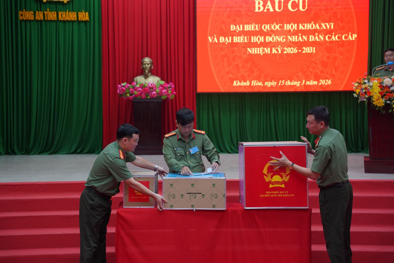 Hòa chung không khí của ngày hội non sông, sáng nay (ngày 15/3/2026), điểm bỏ phiếu số 17 Công an tỉnh Khánh Hoà tổ chức Lễ khai mạc và bầu cử Đại biểu Quốc hội khóa XVI và đại biểu HĐND các cấp nhiệm kỳ 2026 - 2031. Tham dự buổi Lễ có đồng chí Thiếu tướng Nguyễn Hữu Phước, Ủy viên ban thường vụ Tỉnh ủy, Bí thư đảng ủy, Giám đốc Công an tỉnh; các đồng chí trong Ban thường vụ Đảng ủy Công an tỉnh, cùng đông đảo cử tri thuộc lực lượng Công an tỉnh Khánh Hòa.