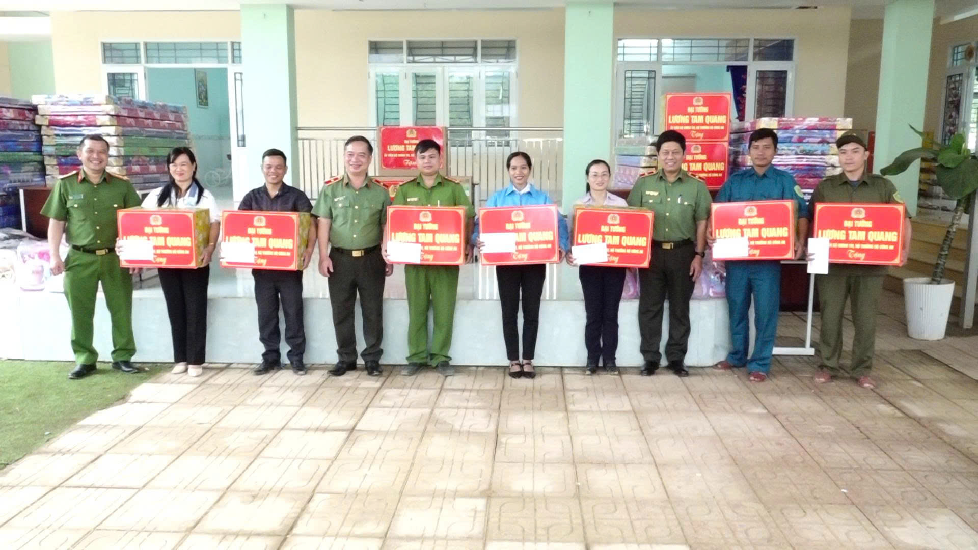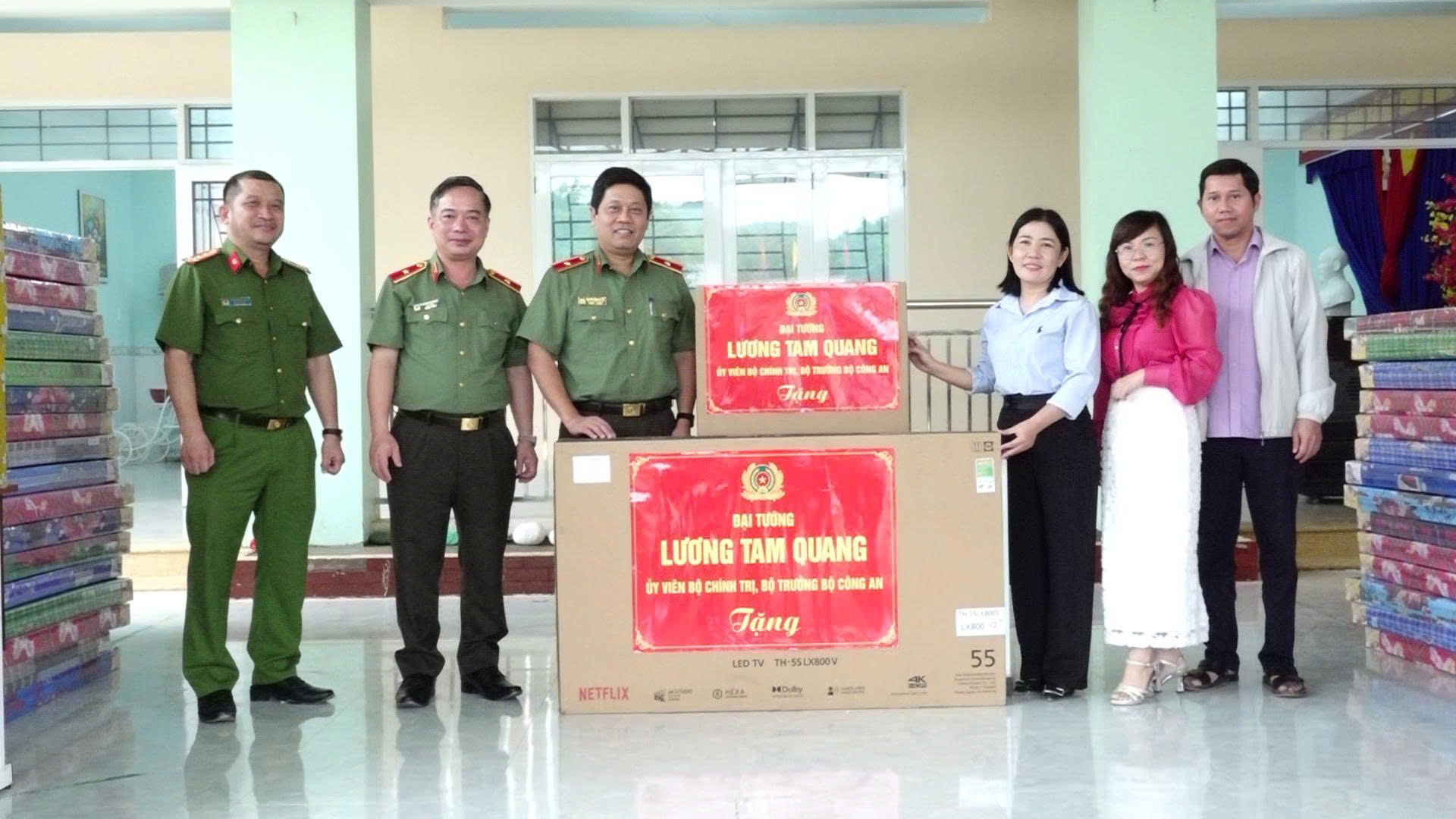 Thừa uỷ quyền của Bộ trưởng Bộ Công an Thiếu tướng Nguyễn Hồng Nguyên, Phó Chánh Văn phòng Bộ Công an, Phó Trưởng Ban Thường trực Ban Chỉ huy Phòng thủ dân sự Bộ Công an trao các phần quà của Đại tướng Lương Tam Quang, Uỷ viên Bộ Chính trị, Bộ trưởng Bộ Công an cho cán bộ giáo viên, học sinh Trường Mầm non Hoa Hướng Dương