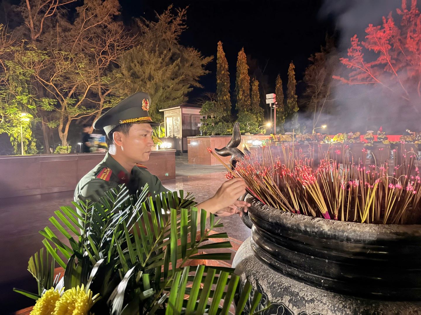 Trong không khí trang nghiêm của Nghĩa trang Hàng Dương, dưới ánh lửa của hàng nghìn nén nhang trong đêm, đoàn công tác đã dành phút mặc niệm thành kính tưởng nhớ các Anh hùng liệt sĩ đã ngã xuống vì độc lập, tự do của Tổ quốc.