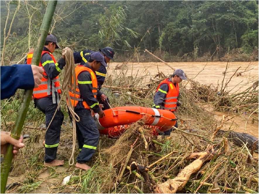 Lực lượng cứu hộ sử dụng các cuộn dây cứu nạn, phao bè cứu sinh, trang bị đầy đủ thiết bị bảo hộ cá nhân để tiếp cận vị trí người bị nạn