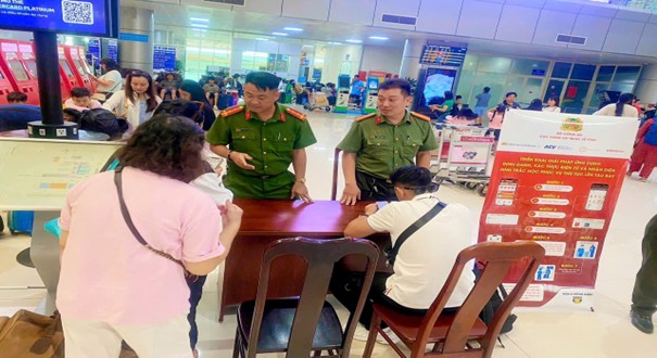 Cán bộ Quản lý xuất nhập cảnh Công an tỉnh Khánh Hòa hướng dẫn công dân làm thủ tục lên tàu bay qua ứng dụng VNeID tại Cảng hàng không quốc tế Cam Ranh.