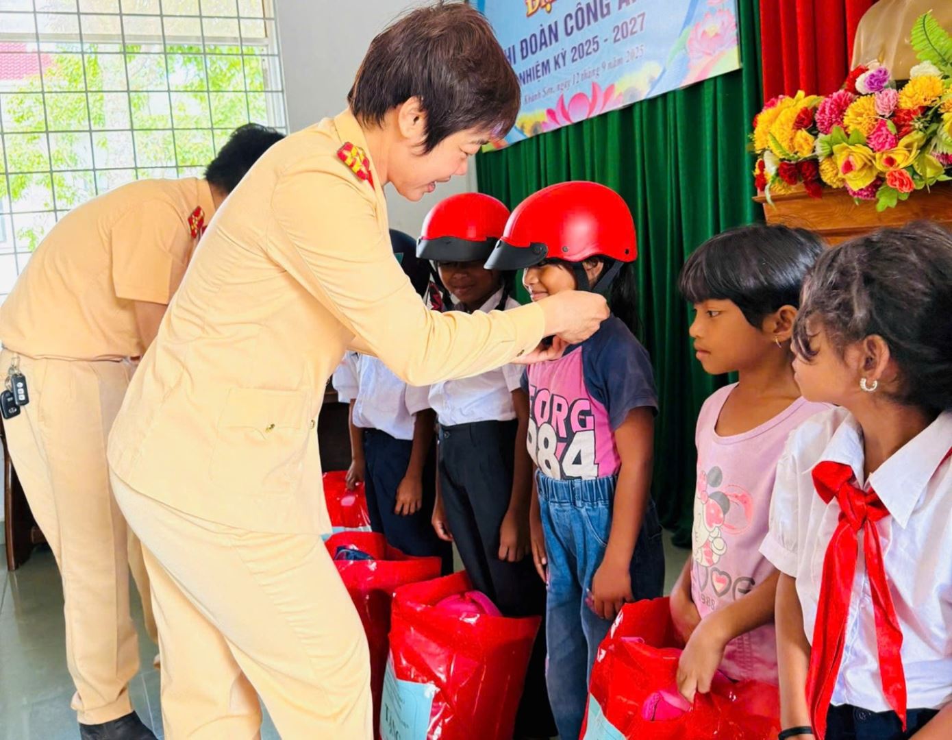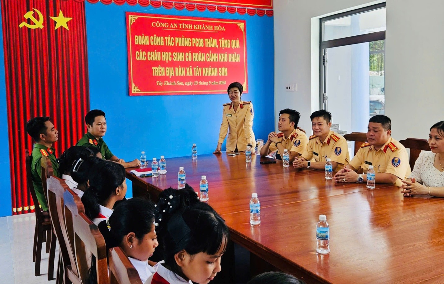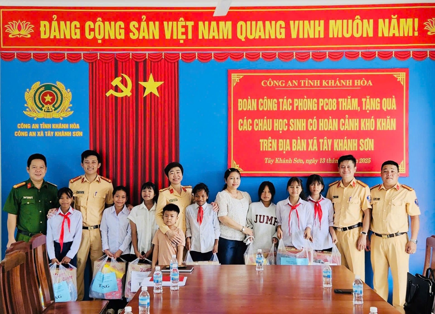 Sáng ngày 13/9/2025, tại trụ sở Công an xã Tây Khánh Sơn, đoàn công tác của Phòng Cảnh sát giao thông Công an tỉnh Khánh Hòa do đồng chí Thượng tá Nguyễn Thị Hồng Hạnh – Phó Trưởng phòng CSGT, làm trưởng đoàn đã đến thăm và tặng quà cho các em có hoàn cảnh khó khăn trên địa bàn.