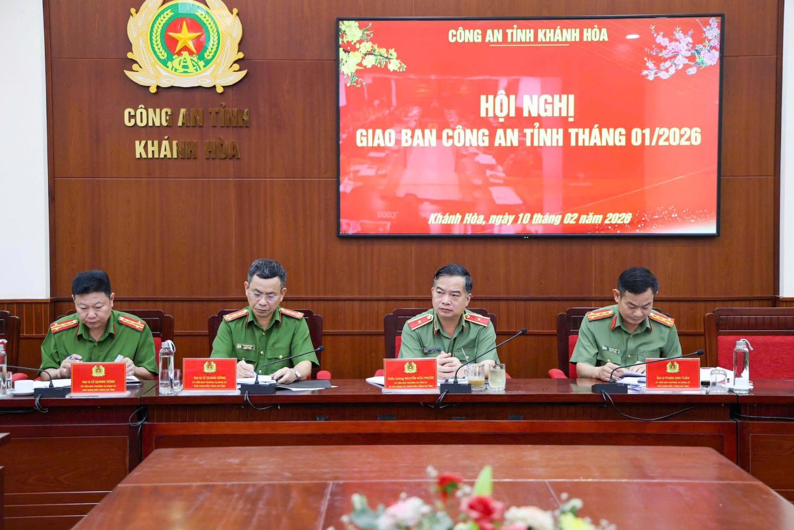 Sáng ngày 10/2, Công an tỉnh Khánh Hòa tổ chức Hội nghị giao ban công tác Công an tháng 1 -2026. Thiếu tướng Nguyễn Hữu Phước, Ủy viên BTV Tỉnh ủy, Bí thư Đảng ủy, Giám đốc Công an tỉnh chủ trì hội nghị. Tham dự hội nghị còn có các đồng chí Phó Giám đốc; lãnh đạo các phòng nghiệp vụ trong Công an tỉnh. Hội nghị được kết nối trực tuyến đến Công an 64 xã, phường trên địa bàn tỉnh.