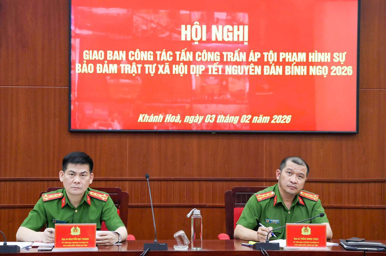 Chiều 03/02, tại Hà Nội, Thượng tướng Nguyễn Văn Long, Uỷ viên Trung ương Đảng, Thứ trưởng, Thủ trưởng Cơ quan Cảnh sát điều tra Bộ Công an chủ trì Hội nghị giao ban công tác tấn công, trấn áp tội phạm hình sự bảo đảm trật tự xã hội dịp Tết Nguyên đán Bính Ngọ 2026. Hội nghị được tổ chức dưới hình thức trực tuyến đến Công an các tỉnh, thành phố; kết nối đến Công an cấp xã. Tại đầu cầu Công an tỉnh Khánh Hòa, Đại tá Nguyễn Bá Thành, Phó Giám đốc, Thủ trưởng Cơ quan Cảnh sát điều tra và Đại tá Trần Minh Trúc, Phó Giám đốc Công an tỉnh tham dự.