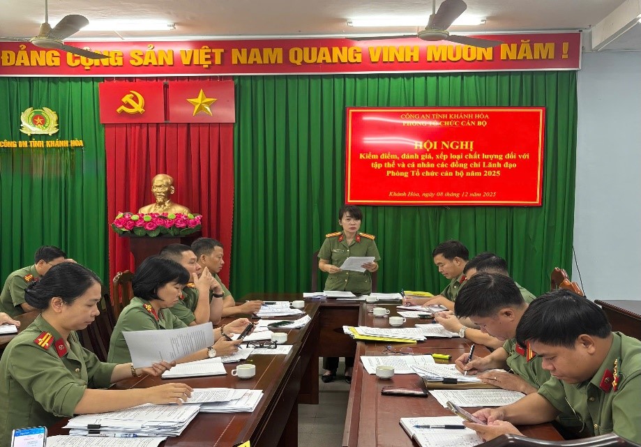 Sáng ngày 08/12/2025, Phòng Tổ chức cán bộ Công an tỉnh tổ chức Hội nghị kiểm điểm, đánh giá, xếp loại chất lượng đối với tập thể và cá nhân các đồng chí Lãnh đạo Phòng Tổ chức cán bộ năm 2025; Thượng tá Trịnh Thị Ngọc Hoa, Bí thư Đảng ủy, Trưởng phòng PX01 chủ trì Hội nghị.