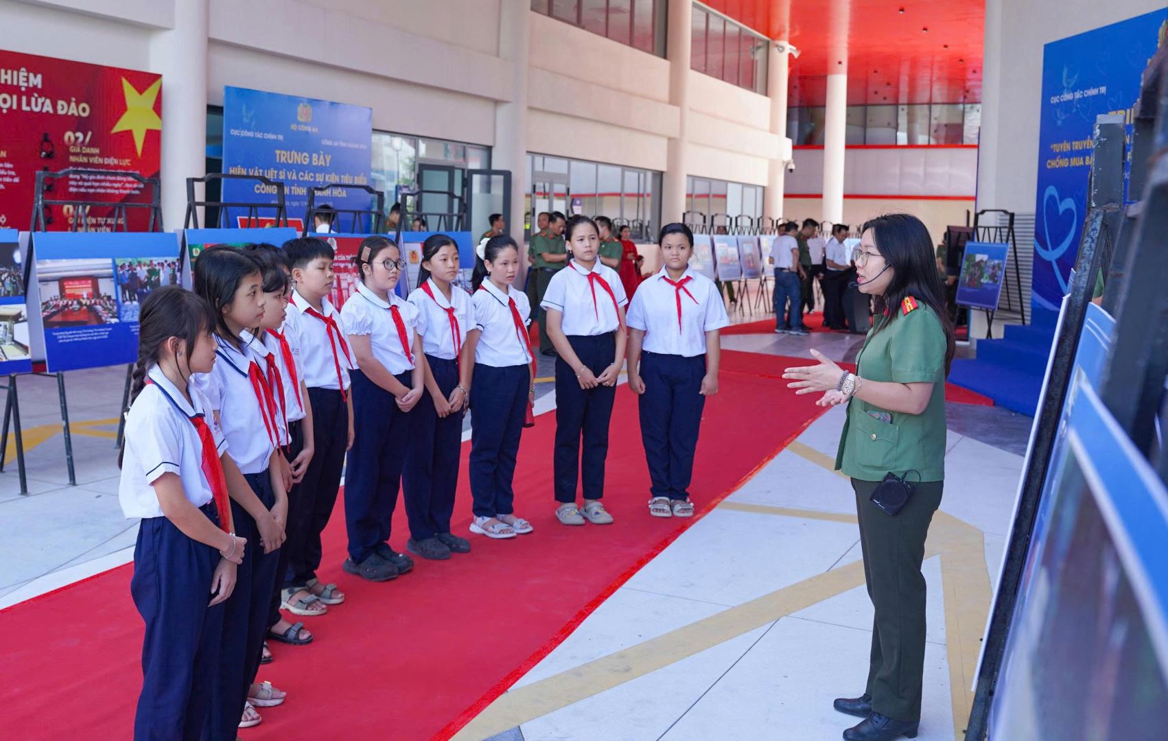 Các em học sinh được tuyên truyền về tội phạm mua bán người khi tham quan tại triển lãm.