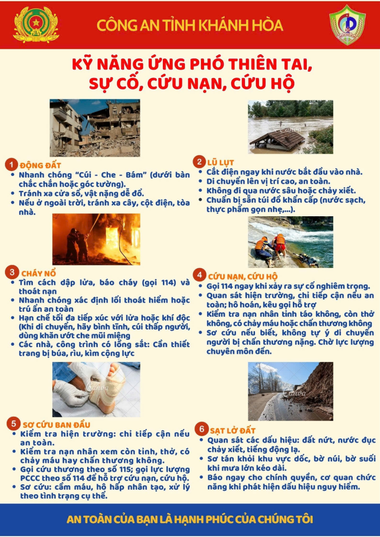 Để nâng cao nhận thức, kỹ năng và khả năng sẵn sàng ứng phó trước các tình huống thiên tai, sự cố, tai nạn có thể xảy ra trong đời sống hằng ngày, Công an tỉnh Khánh Hòa hướng dẫn một số kỹ năng cơ bản sau: